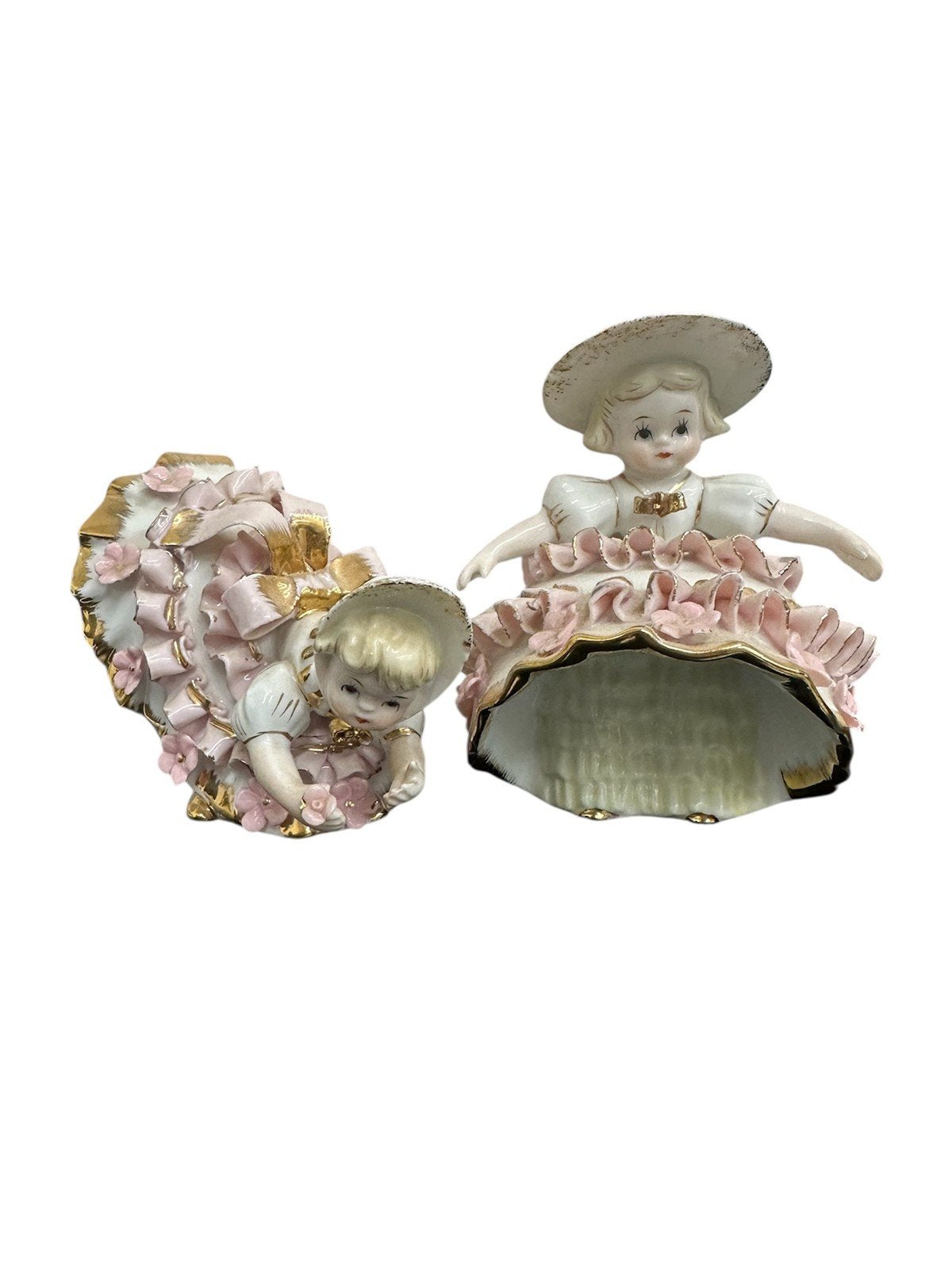 Set of 2 Vintage Lefton Porcelain Figurines Pink Gold & White Ruffle Dress Girls