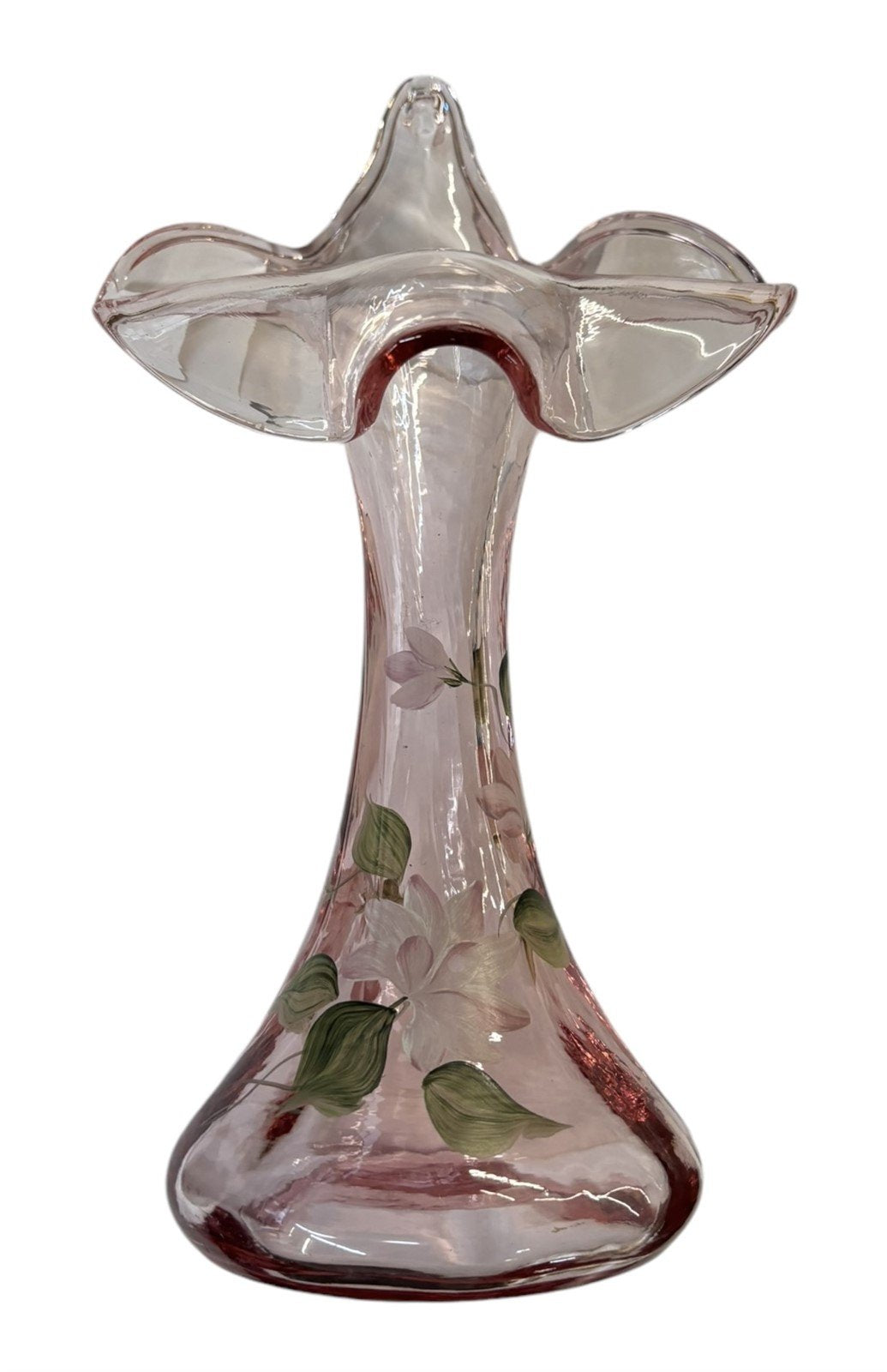 Fenton Vase Handpainted Pink Floral Art Glass Ruffled Edge Signed Bottom