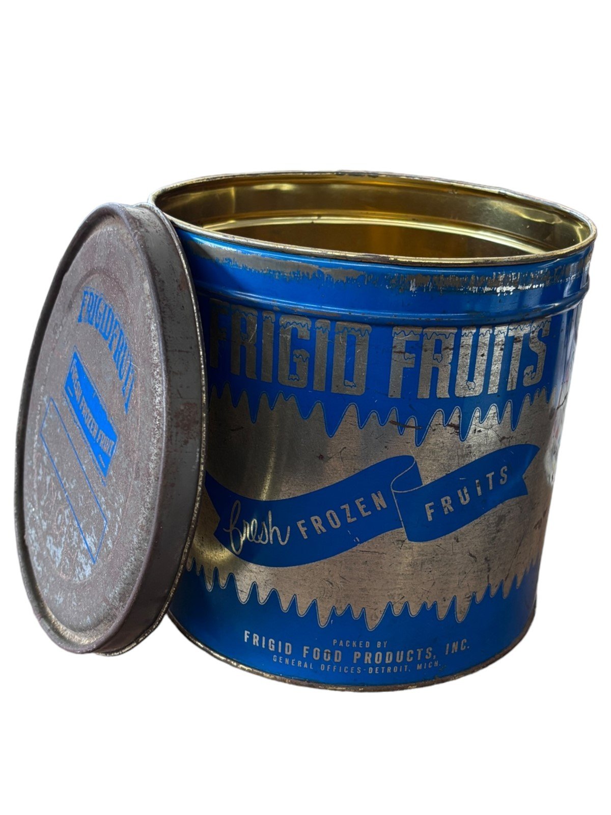 Frigid Fruits Fresh Frozen Fruits 10IB Tin Blue and Silver Vintage
