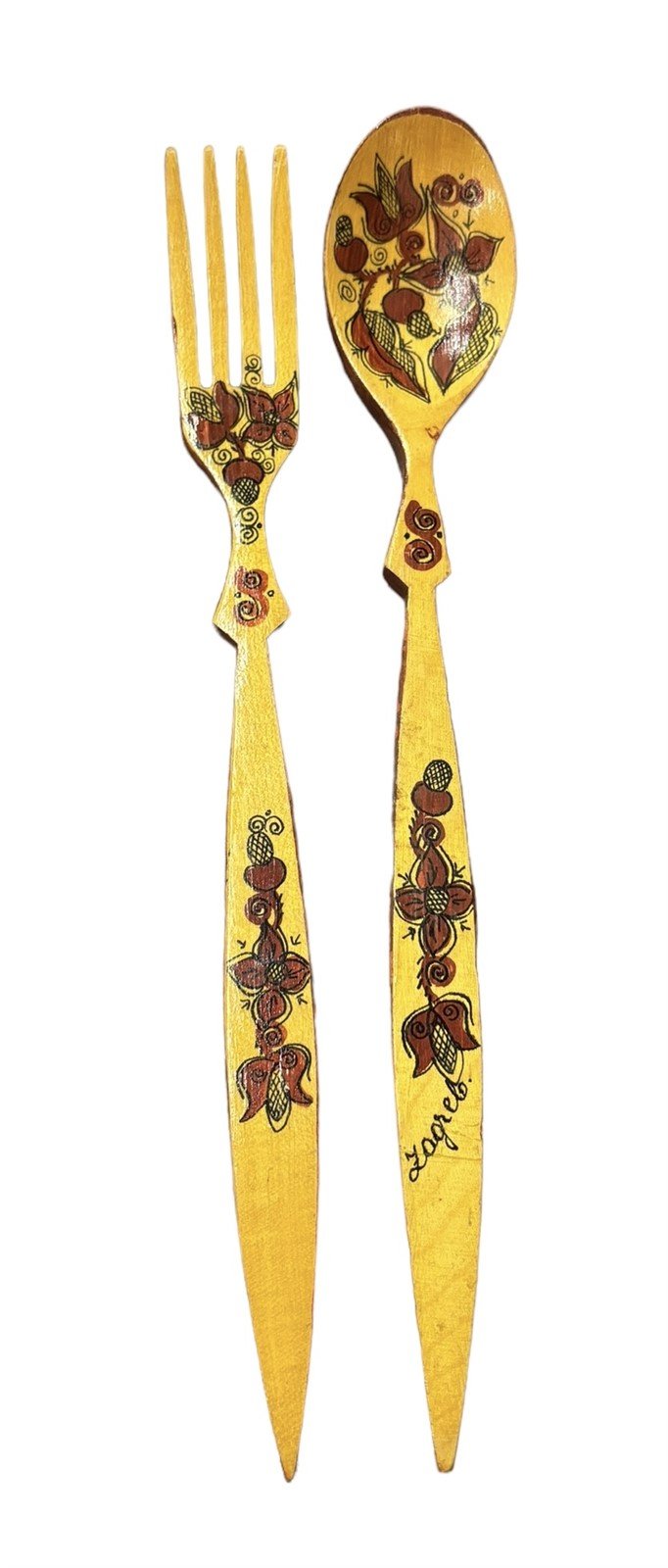 Wooden Spoon Fork Set of 2 Hand Painted Floral Red Serving Dining Vintage