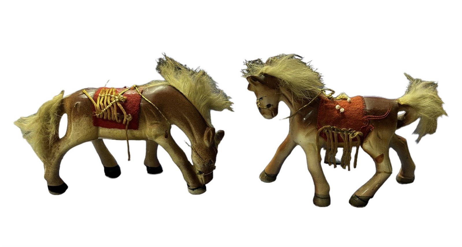 Bone China Horses Pair Red Saddle Rabbit Fur Mane and Tail Ceramic Figures