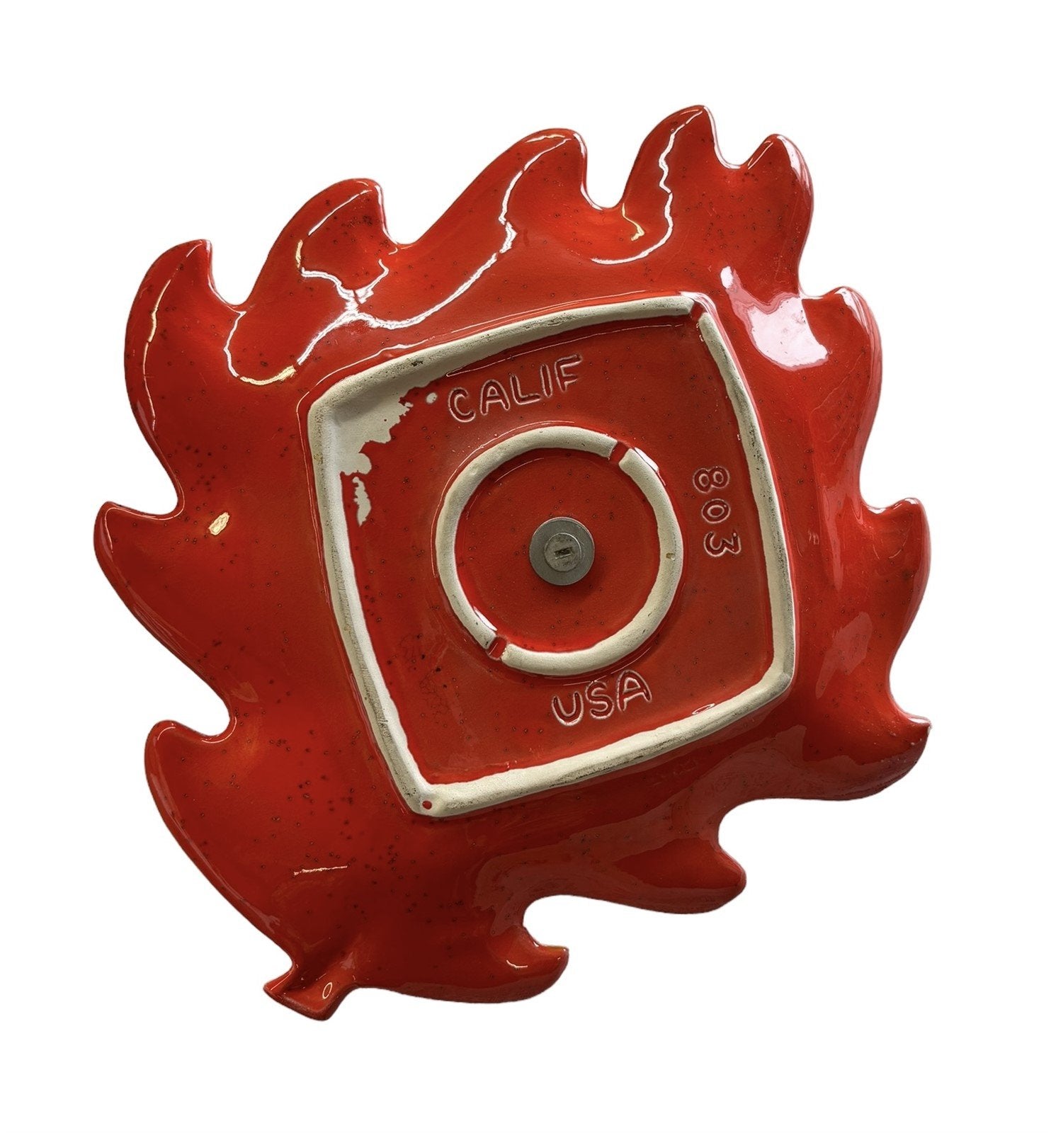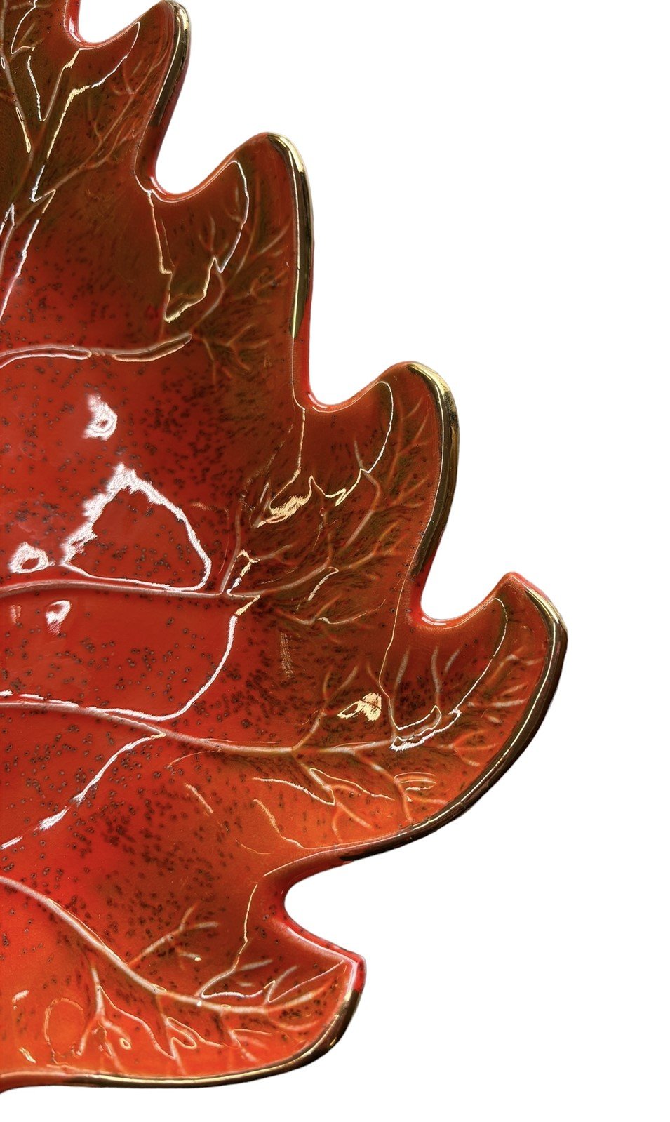 Adorable California Pottery Oak Leaf Serving Platter. Features a cute gold rim and handle Perfect piece for fall! This beautiful tray measures 12" x 11" x 7". Makes a great centerpiece or beautiful dining platter! In great condition, other than minor cosmetic chipping on the bottom. The details and coloring on this piece are just gorgeous.Take a look at the pictures for the best description. A photo is as good as a thousand words and is the best description of cosmetic condition. Use your ZOOM TOOL to best see this item! Please look closely at the photos for condition answers.