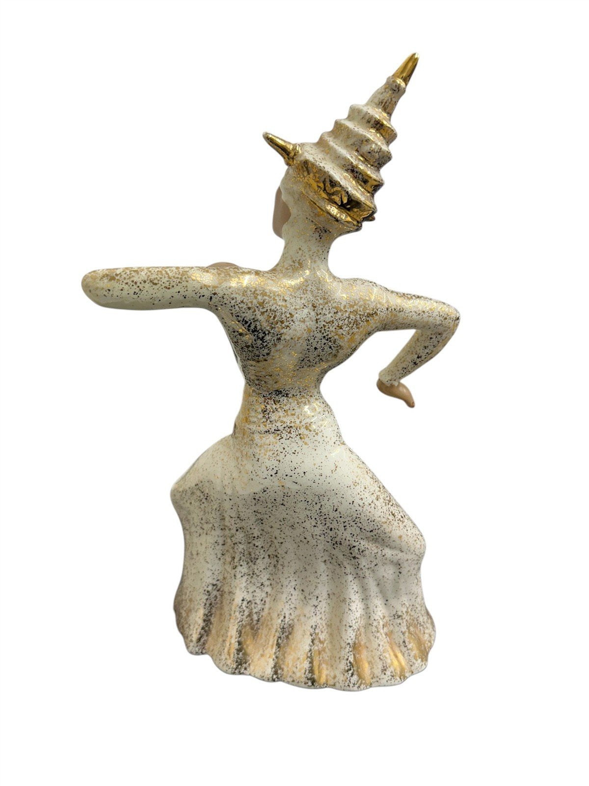 These 1940s mid-century Yona signed figurines are of two Thai Siamese dancers. These figurines feature gold and white speckled traditional Ram Thai headpieces, one of the figurines is female and the other is male. The female figurine is dressed in a gold speckled white gown with a tiered pointed headpiece, from the tip of her headpiece she measures a little over "13in tall with a width of about "7.25in. Similar to the female figurine, the male figurine is also dressed in a gold speckled white gown with a slightly different headpiece, he measures about "12in tall with a width of about "8.75in. The bottom of the male dancer is signed Yona 317 in gold paint, the female dancer is not signed. These figurines are in pristine condition for their age with only minor unnoticeable flaws.