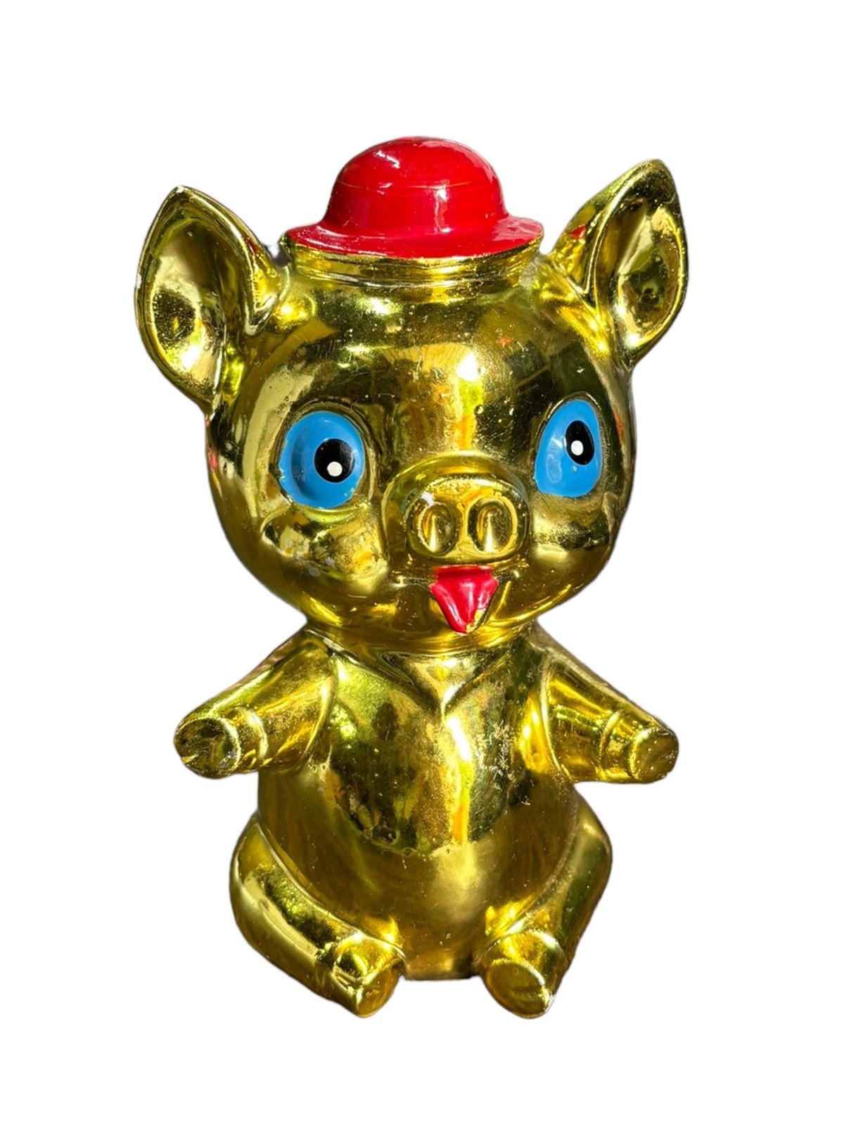 Piggy Bank MCM Gold Pig Red Hat Blue Eyes Vintage Home Decor Retro Japan
