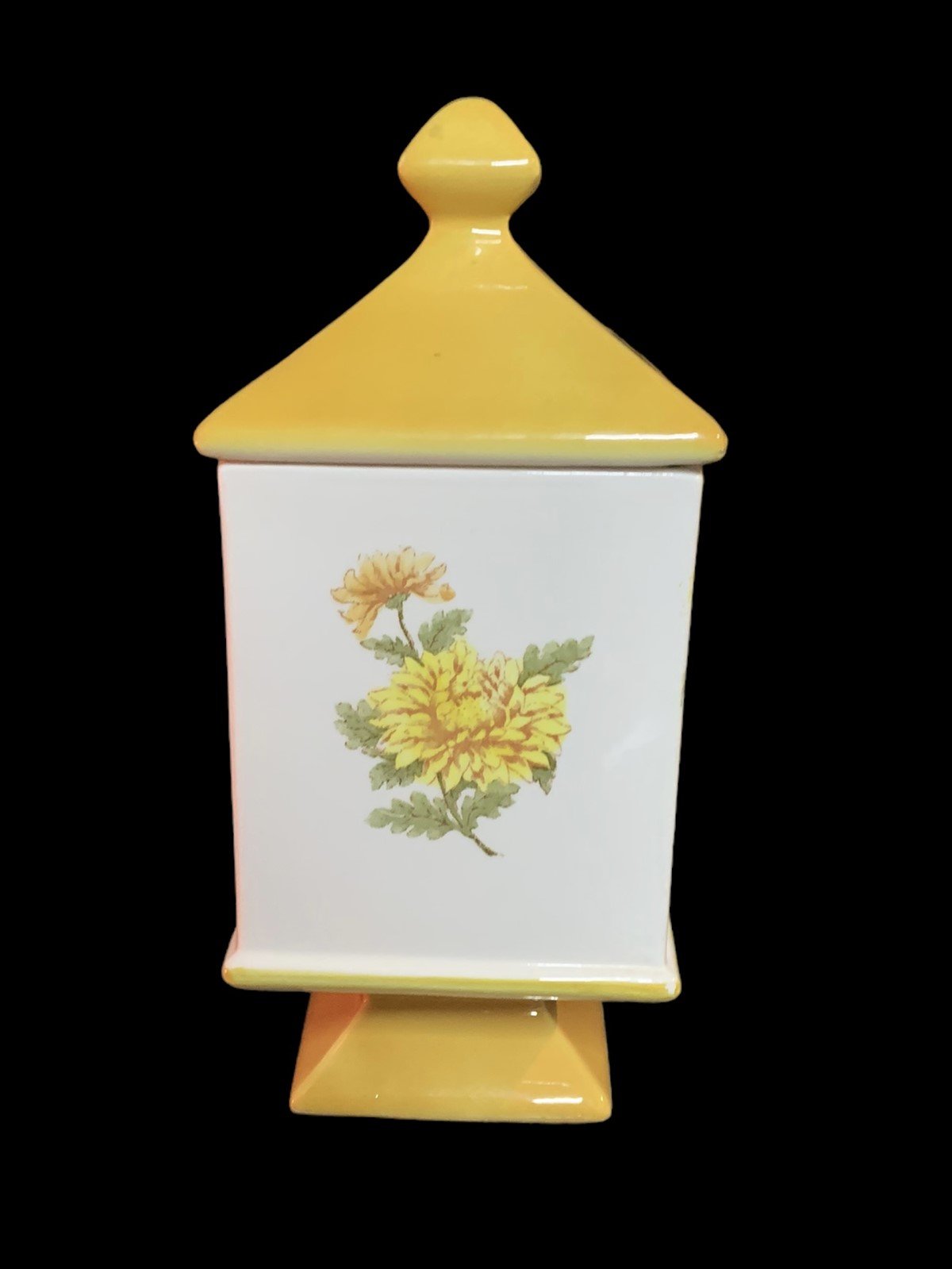 Cookie Jar Pedestal Floral Yellow Chrysanthemum Vase Vintage Canister Home Decor