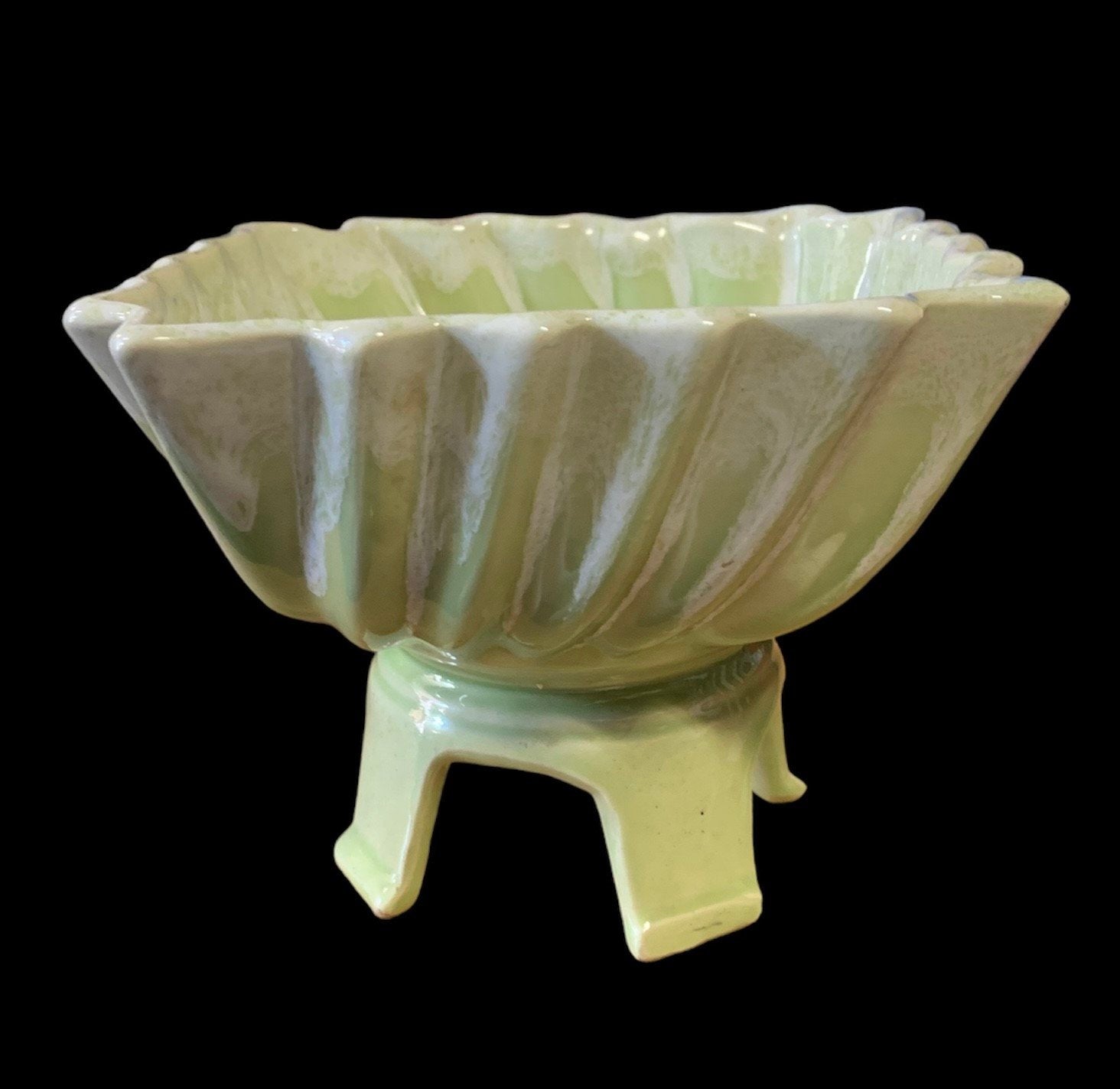 Vintage Pedestal Planter Scalloped Edge Green Marble Mid Century Dish Home Decor