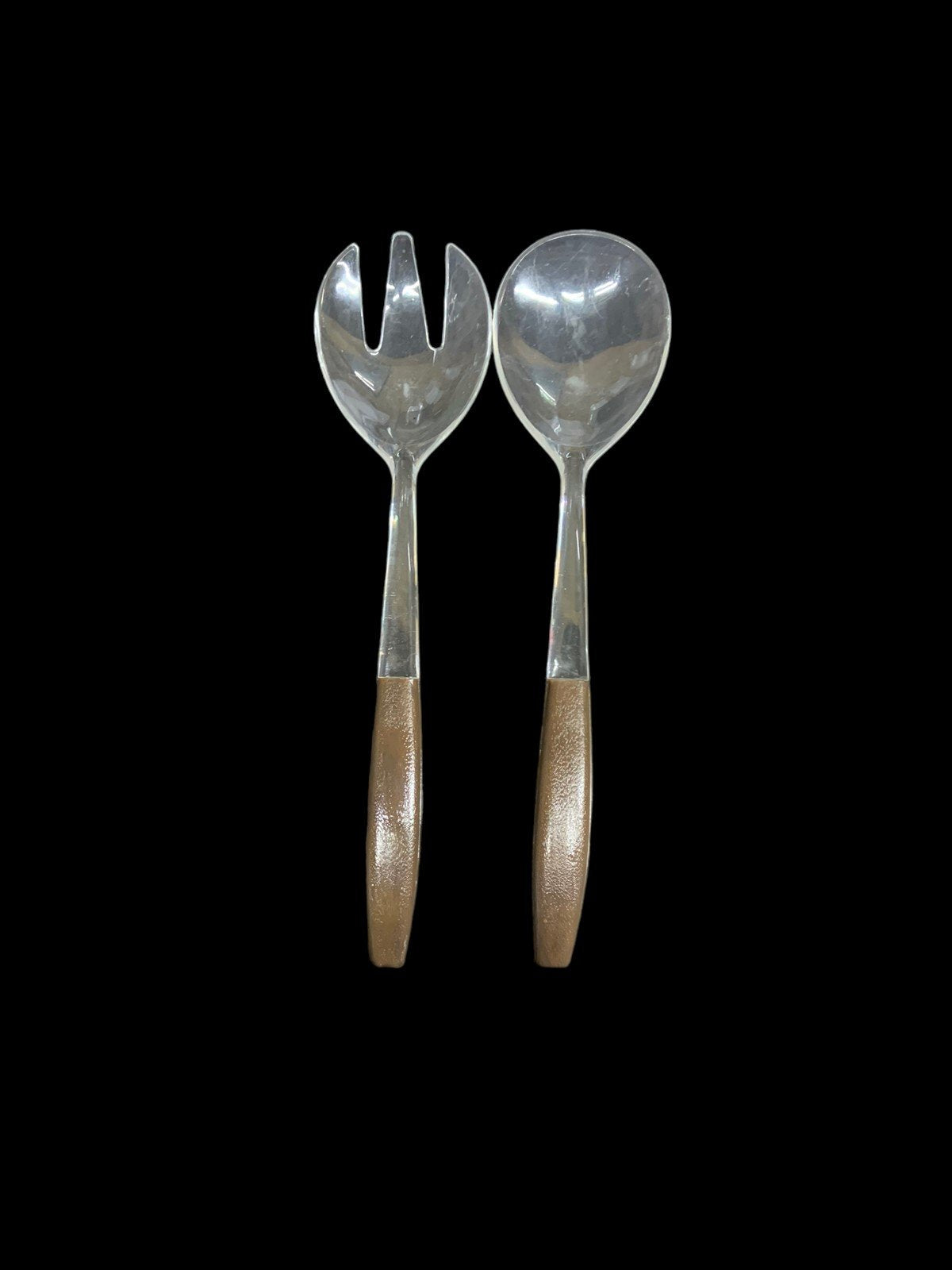 MCM Salad Servers Pair Brown Handle Clear Lucite Spork Spoon Utensils Vintage