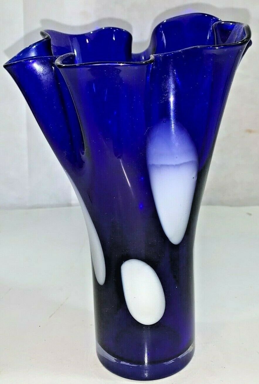 Vintage Mid Century Modern Blown Blue Dotted Glass Fluted Ruffled Vase