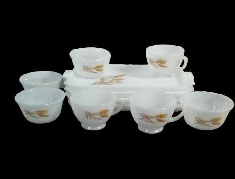 Vintage Antique MCM Fire King Milk Glass Wheat Design Snack Plate w/ Cup