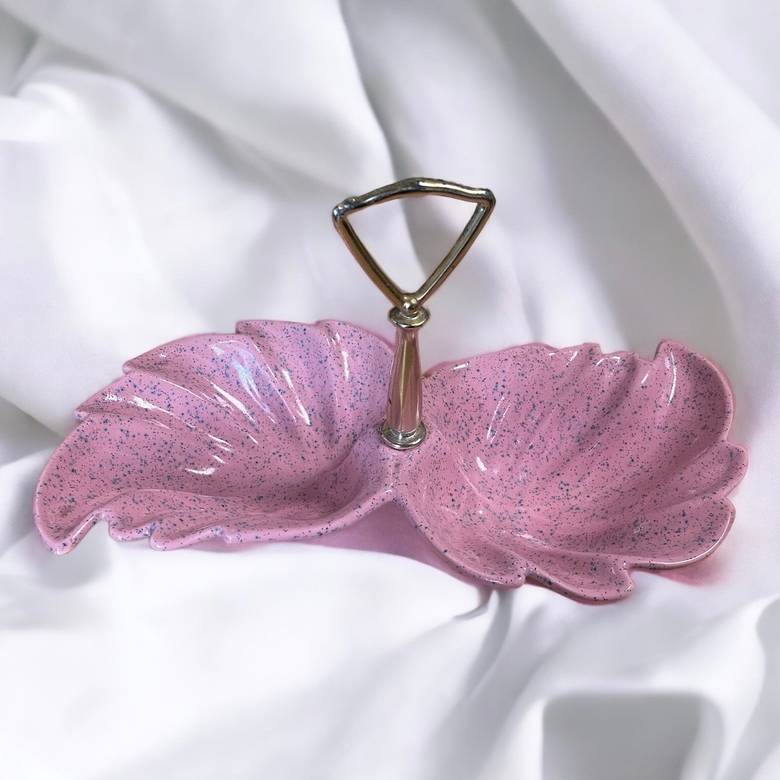 Pink Pottery MCM Vintage Leaf / Shell Design Dish with Gold Handle