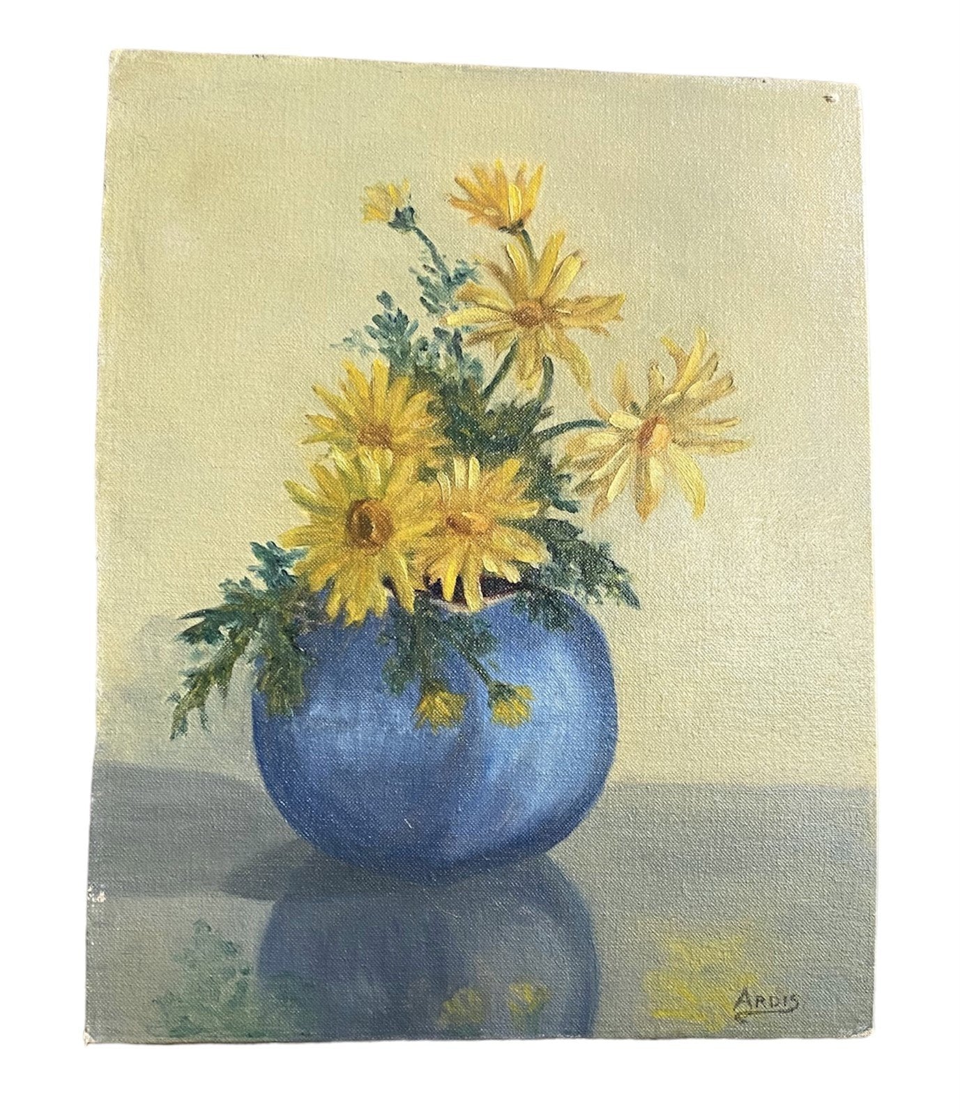 Hand-Painted Yellow Daisy Painting by Ardis Bennett, Mid Century Modern, Antique