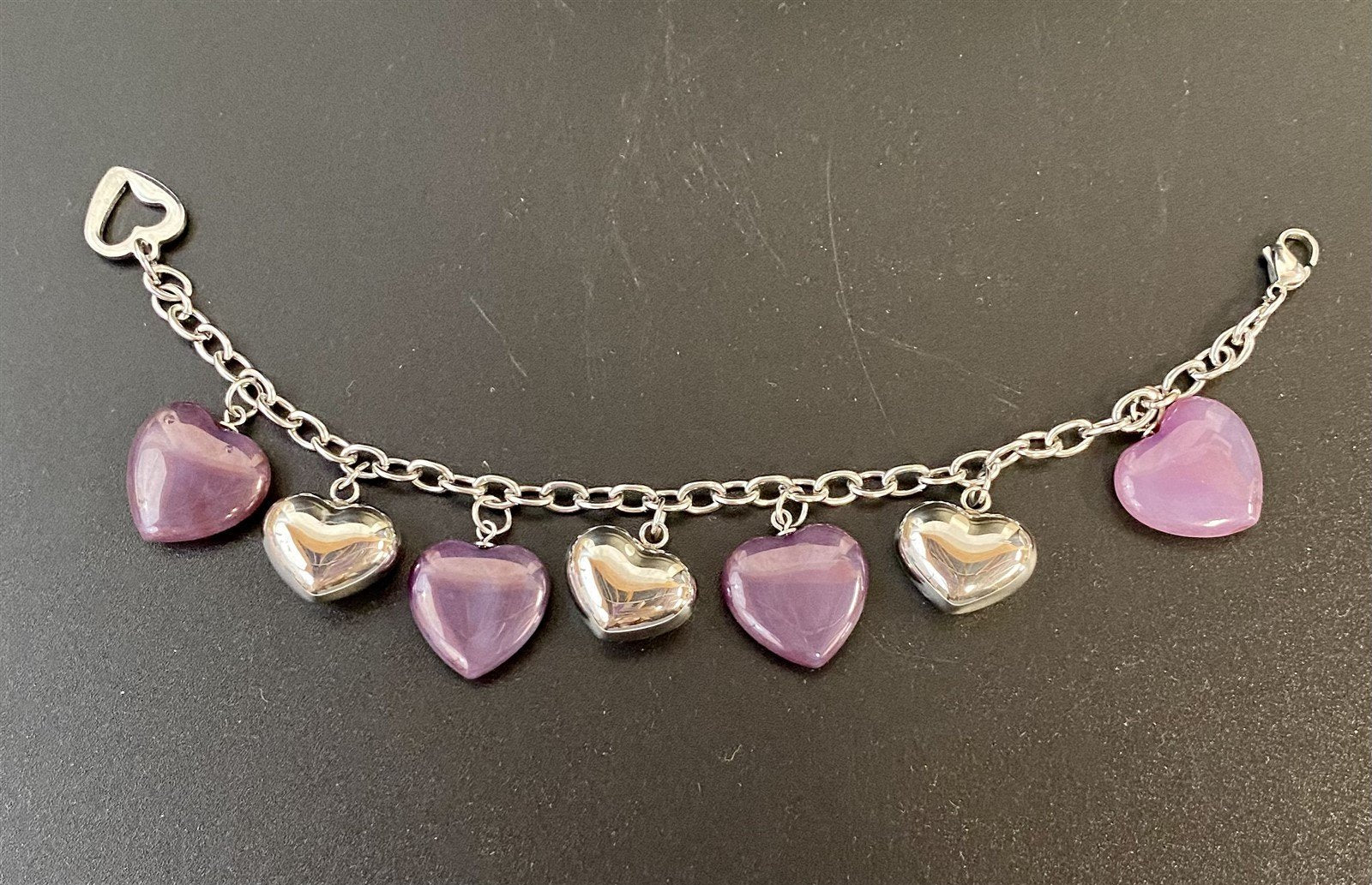 Silver Tone and Amethyst Heart Charm Lobster Clasp Bracelet with Magnetic Box