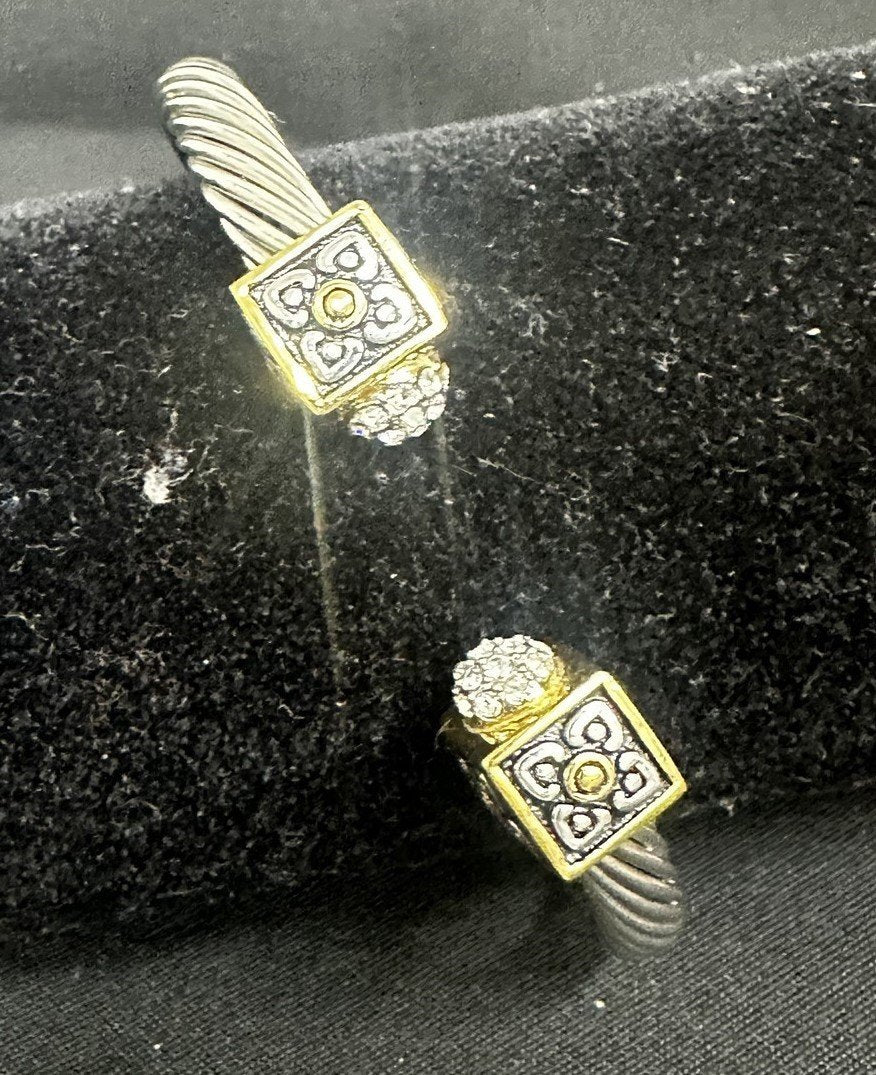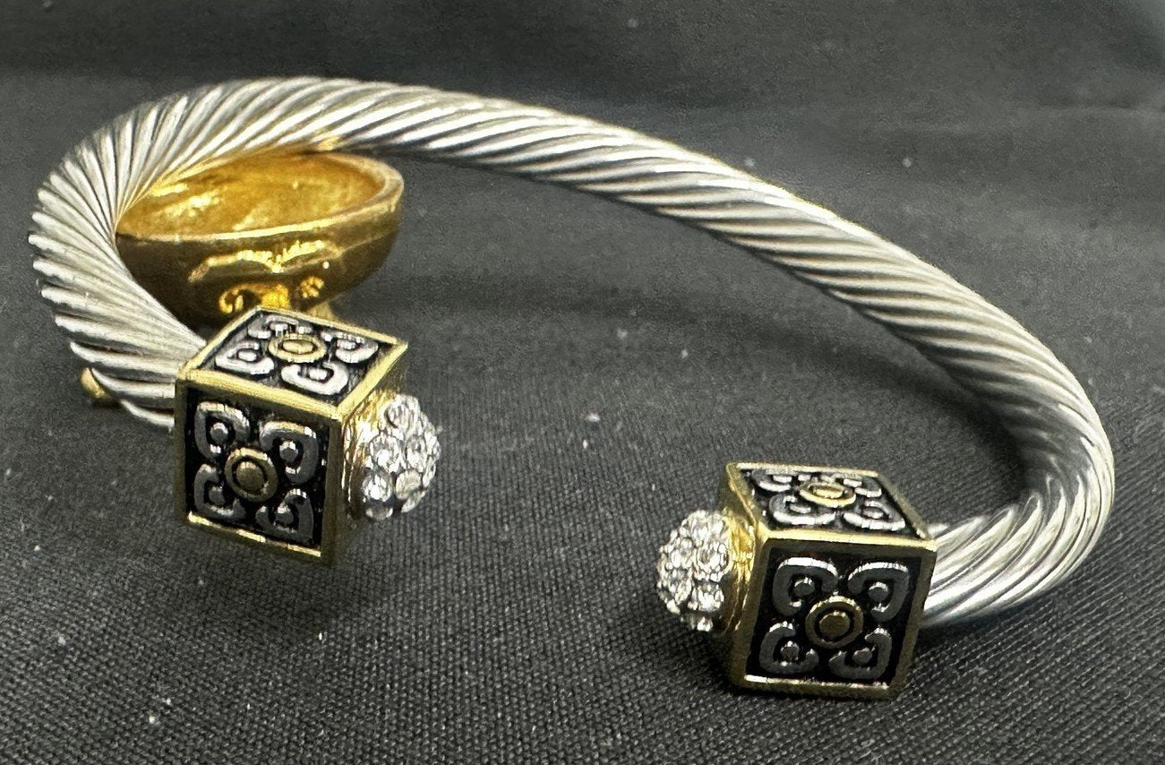 DSMK Vintage stainless steel twisted band cuff with two toned end block detailing. Adorned with rhinestones, of which one is missing. Other than the single missing rhinestone this bracelet is in perfect condition. The end blocks feature a floral design with gold detailing.