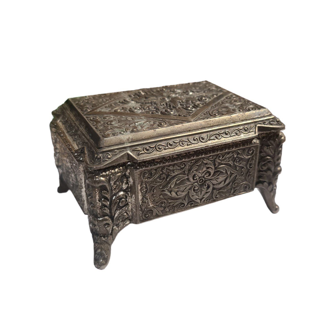 Vintage Metal Footed Jewelry Box Floral Engraved Lidded Trinket Antique Elegant