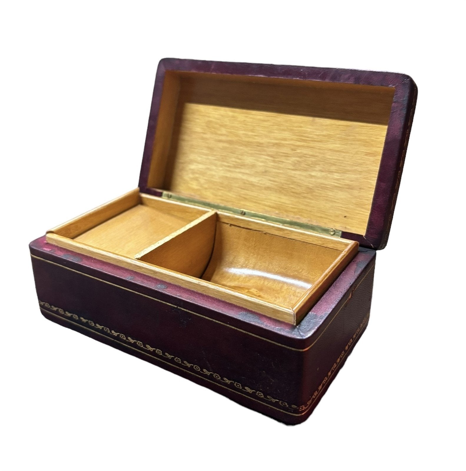 Jewelry Box Vintage Maroon Exterior Gold Detailing Wooden Interior