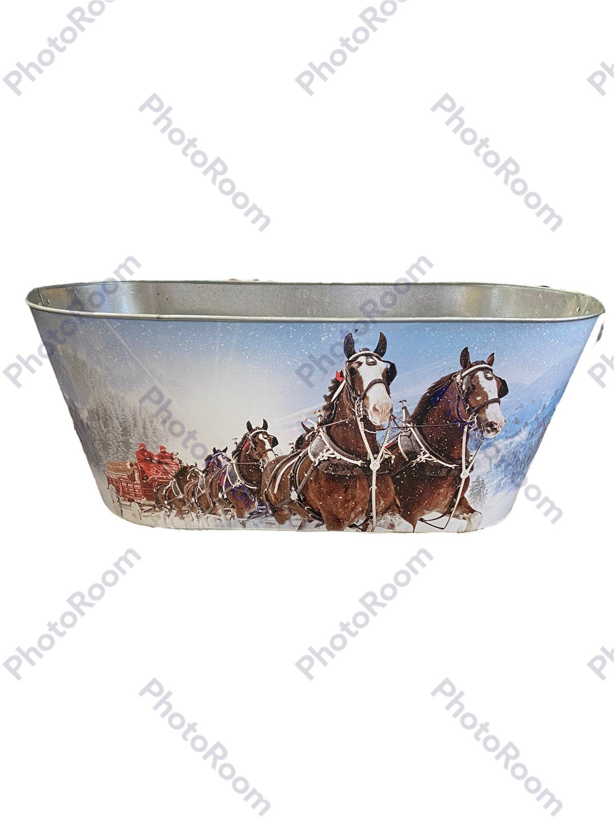Budweiser 100 quart/25 gallon metal beer/drink tub. The metal tub is wrapped with the Budweiser logo in a winter theme with snow and a horse drawn carriage on the backside. Includes 2 metal handles on each side. Perfect gift for any outdoors dads, or for those who always have family bbqs or get togethers! approx 33" long and 15" wide and 13" deep.Take a look at the pictures for the best description. A photo is as good as a thousand words and is the best description of cosmetic condition. Use your ZOOM TOOL to best see this item! Please look closely at the photos for condition answers.