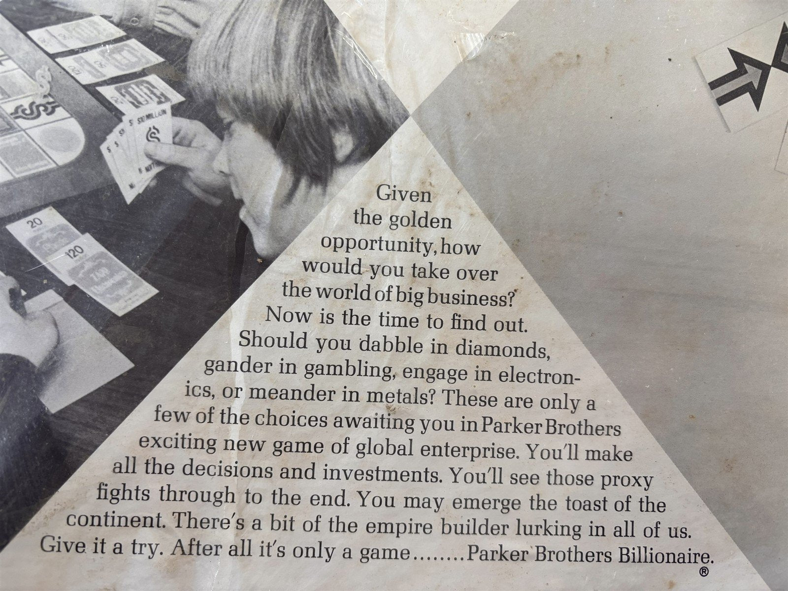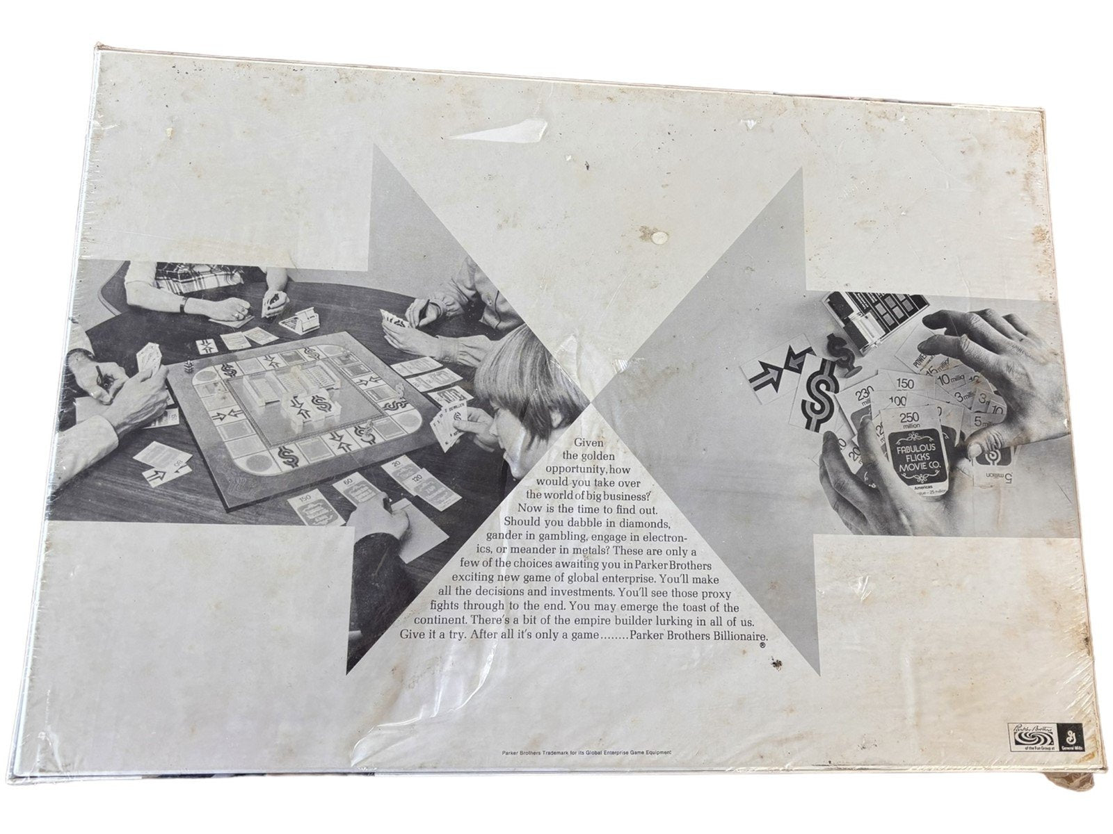 This is the Billionaire boardgame by the Parker brothers! It is unopened, however the seal has a few tears. The actual box is in great condition. It's 20in x 14in x 2in.Take a look at the pictures for the best description. A photo is as good as a thousand words and is the best description of cosmetic condition. Use your ZOOM TOOL to best see this item! Please look closely at the photos for condition answers.