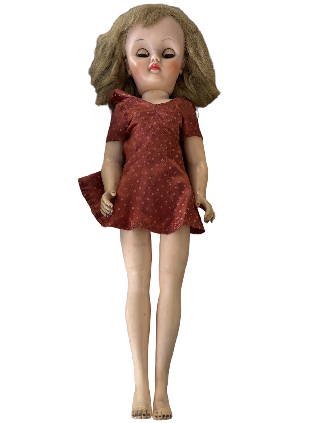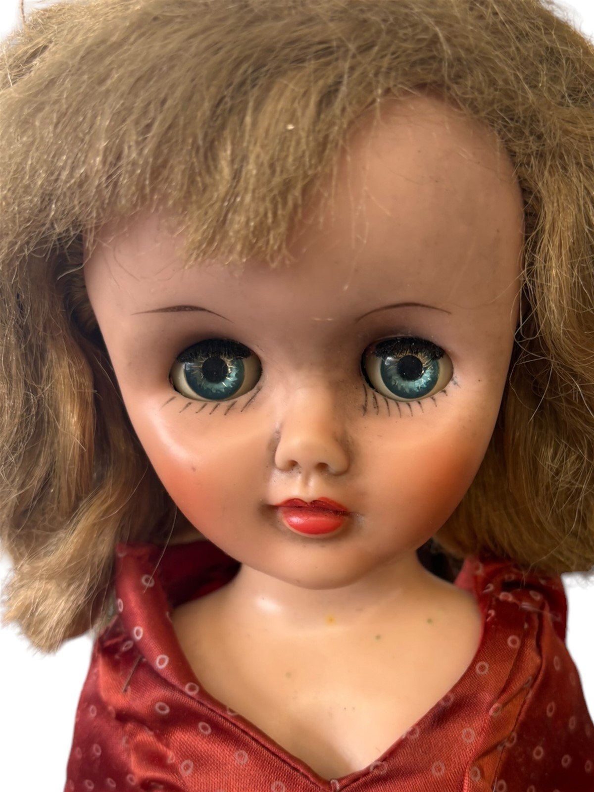 This doll has AE20 on her lower back. She has dirty blond hair. She's 18in tall. Her feet are in a tip toe position.Take a look at the pictures for the best description. A photo is as good as a thousand words and is the best description of cosmetic condition. Use your ZOOM TOOL to best see this item! Please look closely at the photos for condition answers.