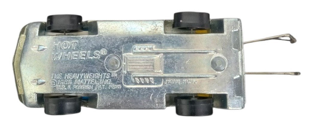 This is a vintage Hot Wheels Heavyweights tow truck made in 1969. Marks and scratches are visible. The paint shows wear in places. This is a great item for any aspiring collector and is a perfect addition to any toy or Hot Wheels collection! This measures about 3" by 1" by 1".