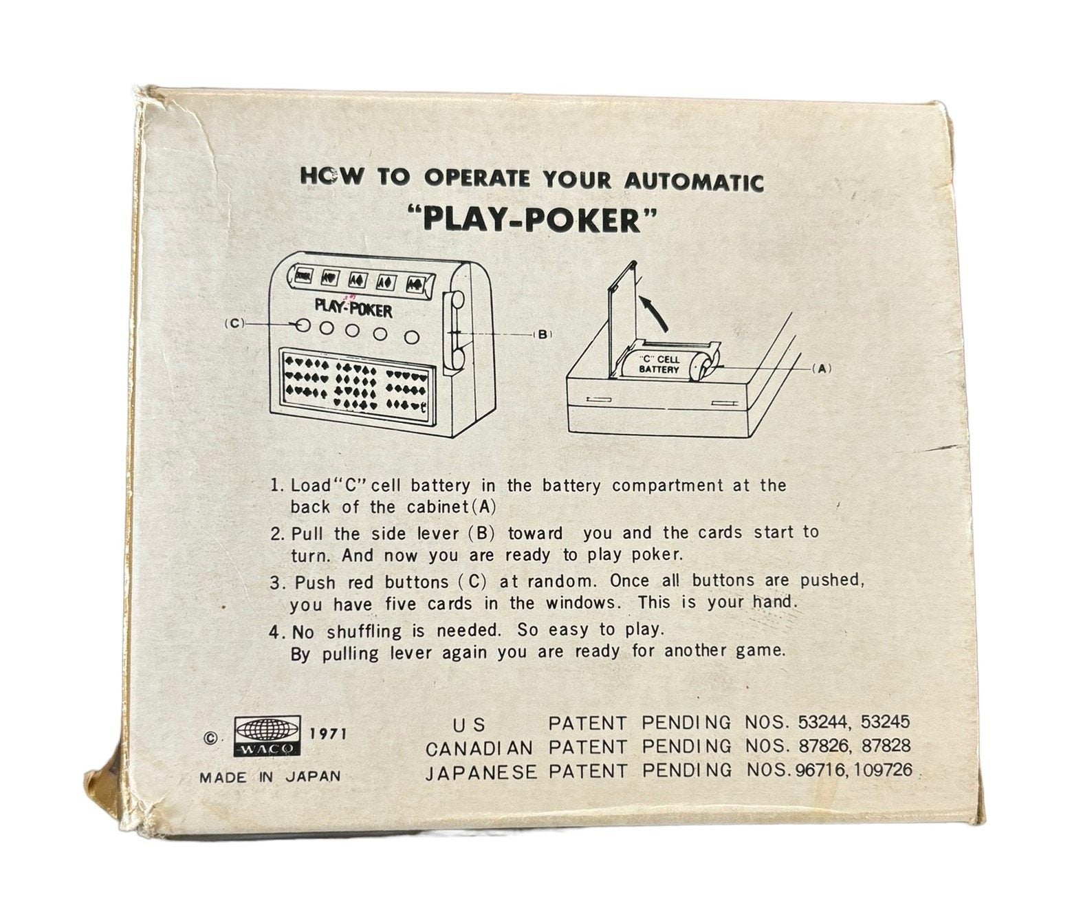 Vintage Cordless Electric Automatic Poker Player. This is from Waco Japan in 1971. In great condition, the battery compartment is spotless! This makes great decor and a great little game! Piece measures 4" x 4.5" x 1.5".Take a look at the pictures for the best description. A photo is as good as a thousand words and is the best description of cosmetic condition. Use your ZOOM TOOL to best see this item! Please look closely at the photos for condition answers.