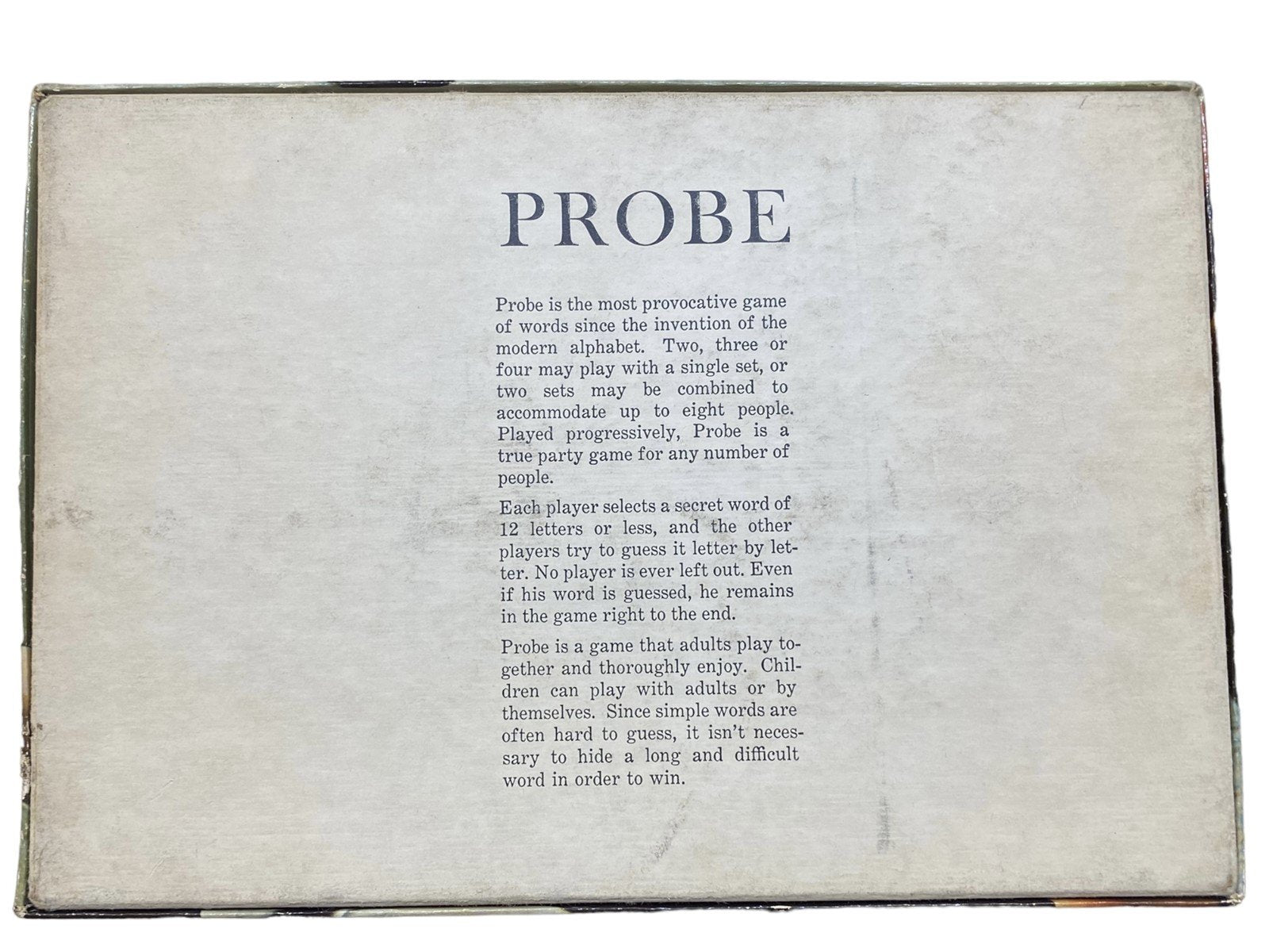This game is called Probe Game of Words by the Parker Bros. 2-8 players. This is a game of secrecy and guessing. You must guess the selected players word letter by letter. The box is 11in x 8in x 2 1/2in.Take a look at the pictures for the best description. A photo is as good as a thousand words and is the best description of cosmetic condition. Use your ZOOM TOOL to best see this item! Please look closely at the photos for condition answers.