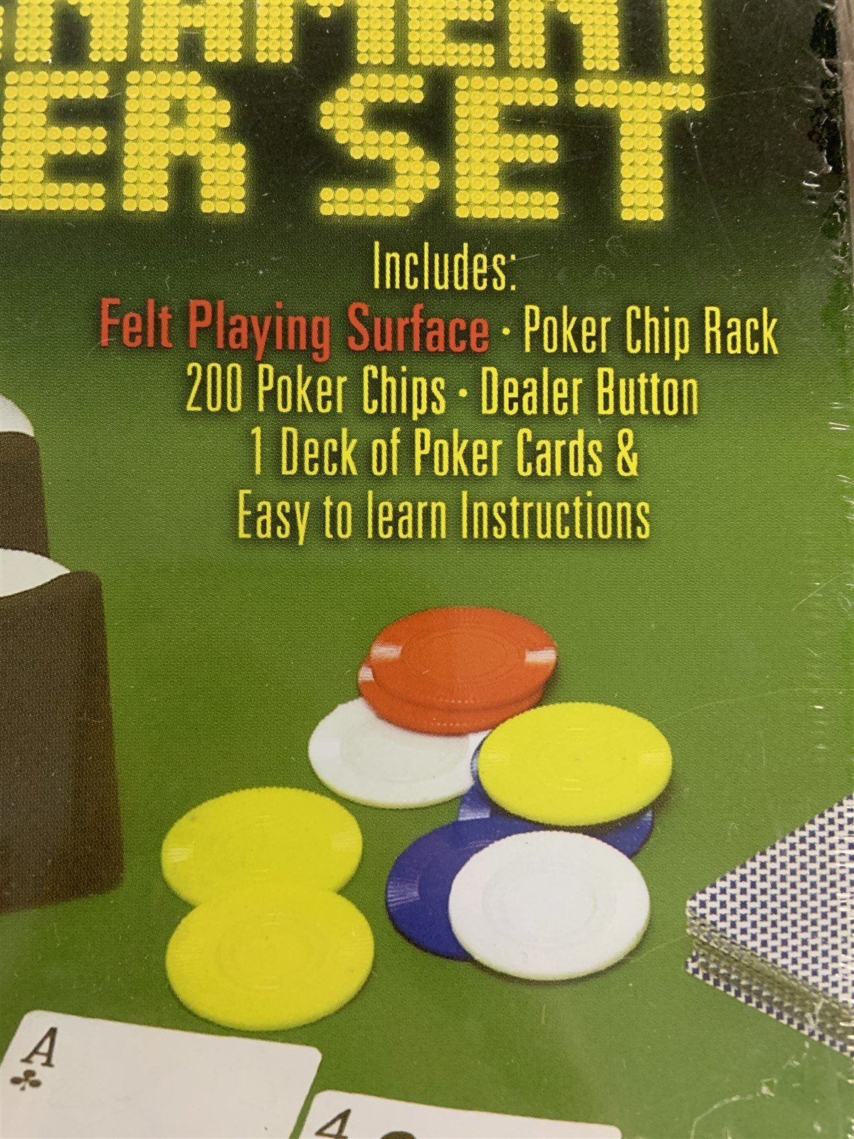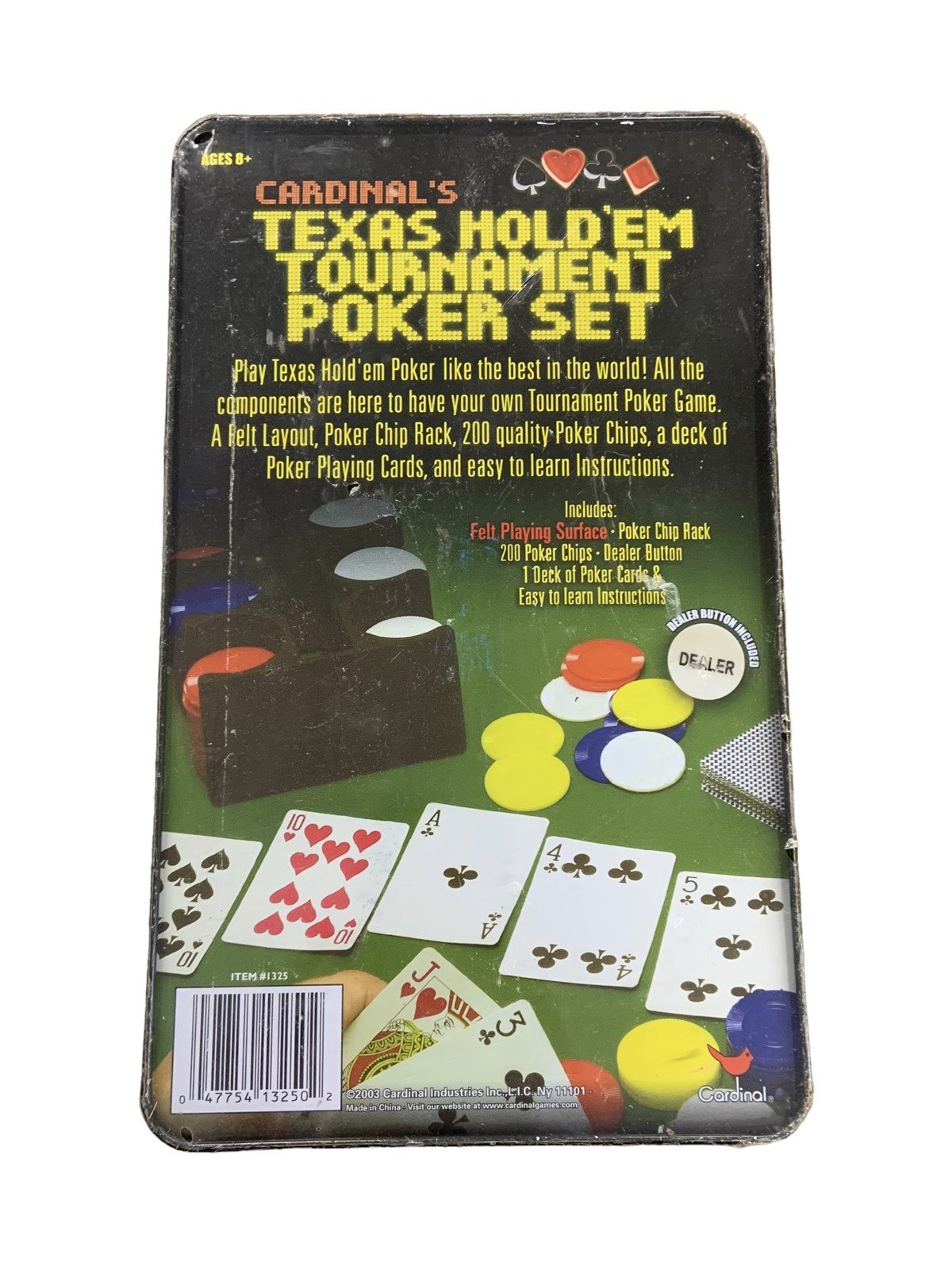 Cardinal's Texas Hold Em Tournament Poker Set. Sealed in original tin. Everything included, check second slide for list. This set is perfect for beginners! Perfect for vacations, car rides, sleepovers, game nights, etc; with the small tin!Take a look at the pictures for the best description. A photo is as good as a thousand words and is the best description of cosmetic condition. Use your ZOOM TOOL to best see this item! Please look closely at the photos for condition answers.