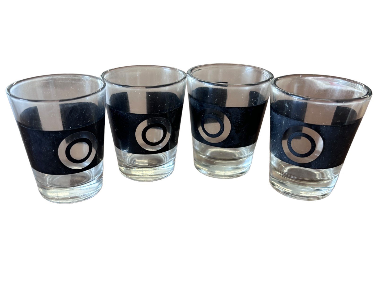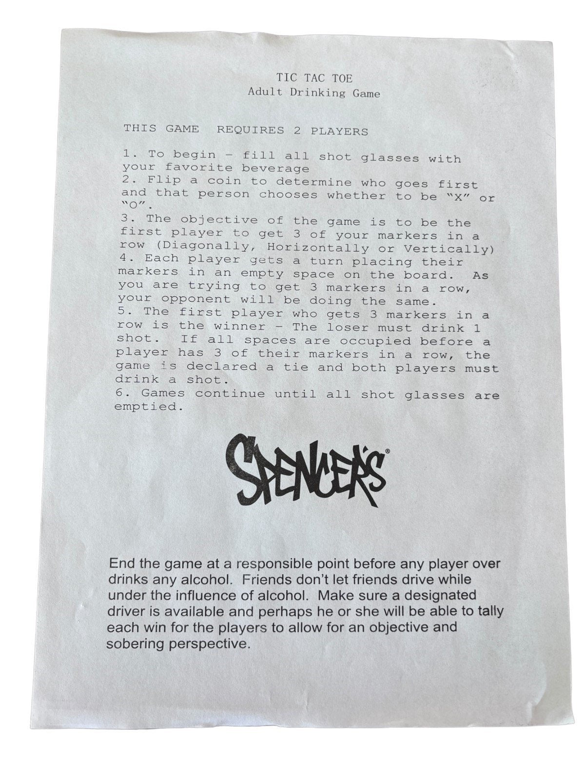 This is a super cool adult shot game of Tic-tac-toe! It as a mirrored playing board and it was made by Spencers. The shot glasses have either a black O or a red X on them. There are five red X shotglasses and four black O shotglasses; each measure 2 1/4in x 1 3/4 and they are 2in deep. Instructions are included. The mirrored playing board has a small chip on the corner (Shown in pics) it measures 11 1/2in x 11 1/2in. The box is in good condition and it measures 18 1/2in x 13in x 2in.Take a look at the pictures for the best description. A photo is as good as a thousand words and is the best description of cosmetic condition. Use your ZOOM TOOL to best see this item! Please look closely at the photos for condition answers.