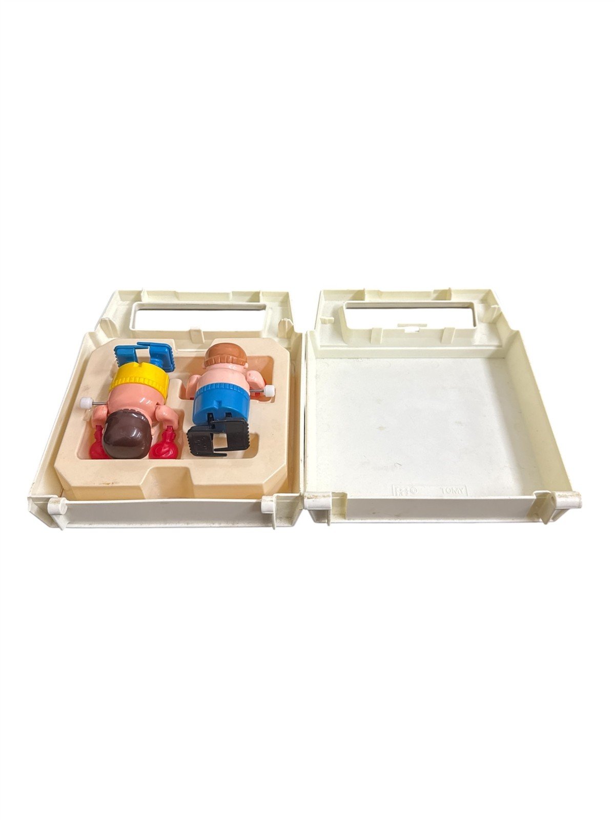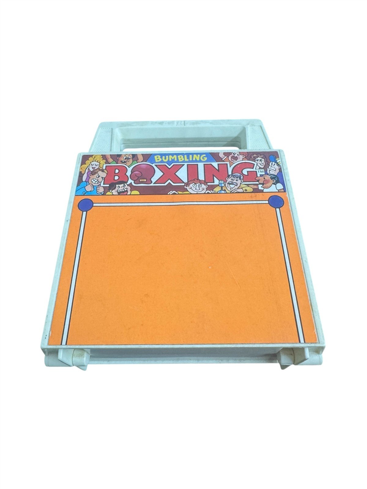 This is a beautiful vintage Bumbling Boxing wind up toy set from TOMY (1980's). This set features a 2 wind up boxers and a folding case that turns into a boxing ring. Good condition, but there are few marks and stains. One windup boxer doesn't function normally and there are no screws holding the case together. This is a perfect piece for any collector!Take a look at the pictures for the best description. A photo is as good as a thousand words and is the best description of cosmetic condition. Use your ZOOM TOOL to best see this item! Please look closely at the photos for condition answers.