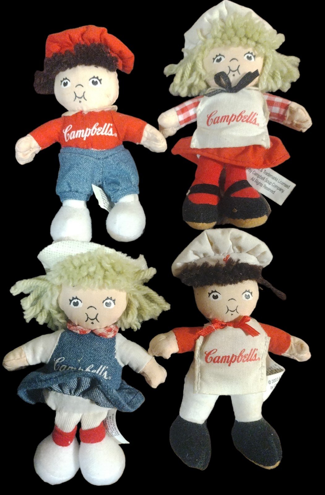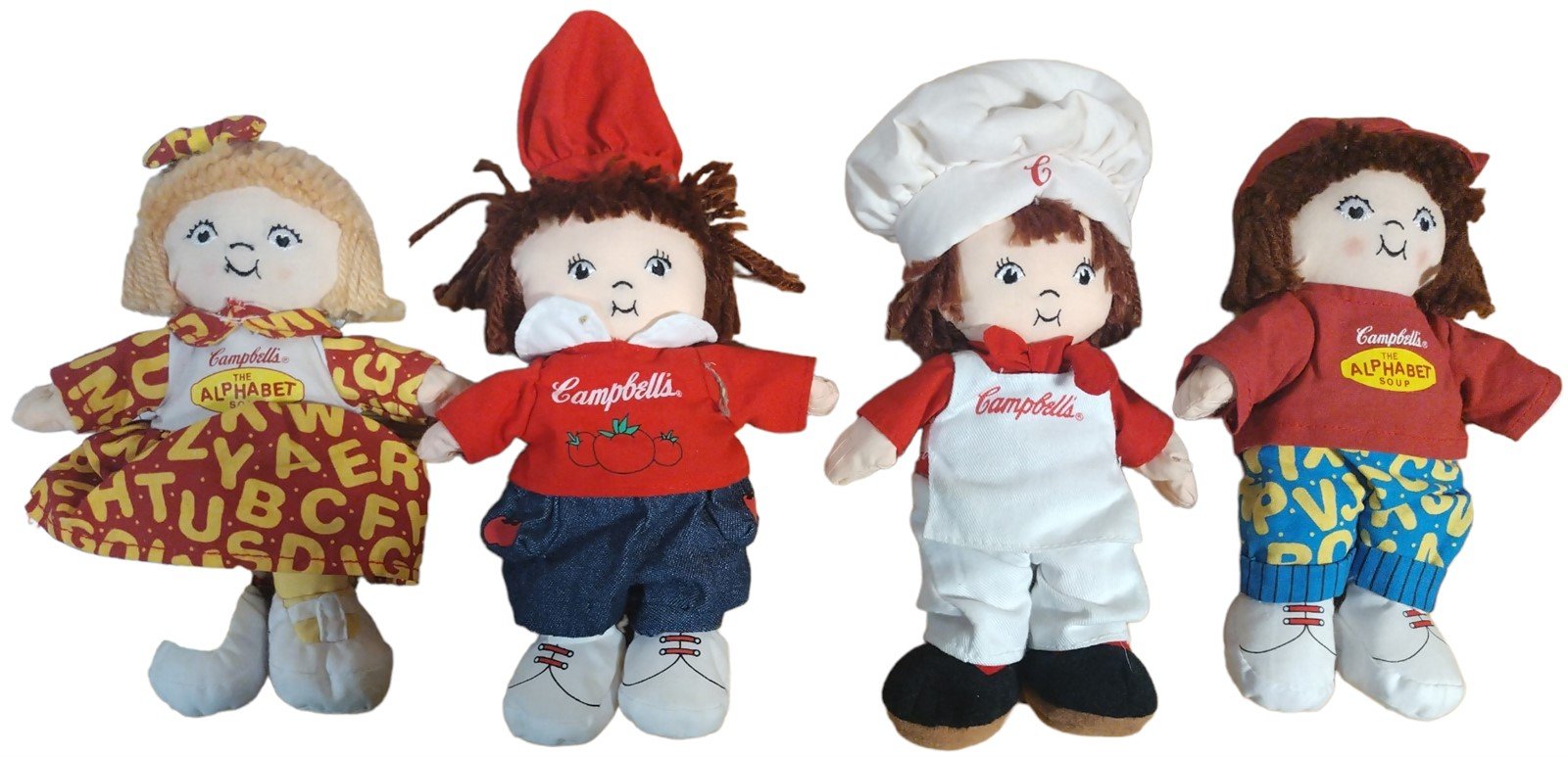 Vintage Set of 4 Different Campbell Kids Soup Plush Dolls Chef & Alphabet Soup