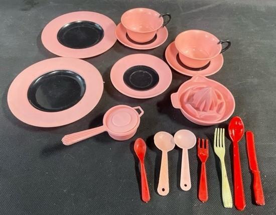 Retro Mid Century Child's Pink Plastic Kitchenware Baner Play Set