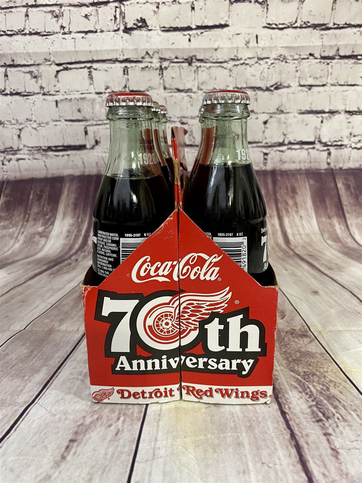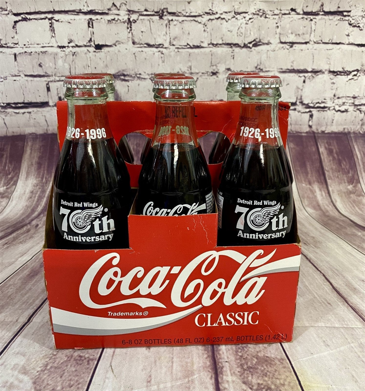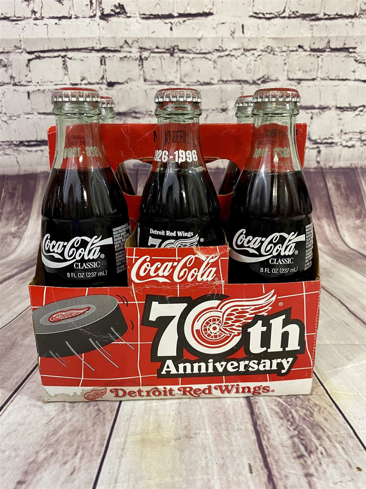 We have a complete unopened 6 pack of 70th anniversary Detroit Red Wings Coca-Cola in glass bottles with carrier for your consideration. Coca-Cola issued these in 1996 to honor the 70th anniversary of the Detroit hockey team known as the Red Wings. The carrier with the bottles in it measures approx. 7 x 8 x 4 inches. Take a look at the pictures for the best description. A photo is as good as a thousand words and is the best description of cosmetic condition. Use your ZOOM TOOL to best see this item! Please look closely at the photos for condition answers. We describe items as best we can and as we see them. Some details may be missed but not intentionally. Condition of an item is our opinion. If you have any questions on the condition of these items let us know before you purchase! Thanks for looking!-
