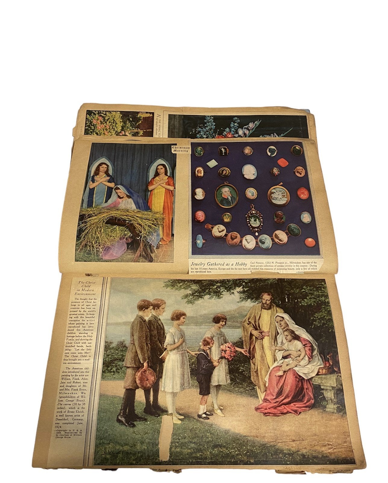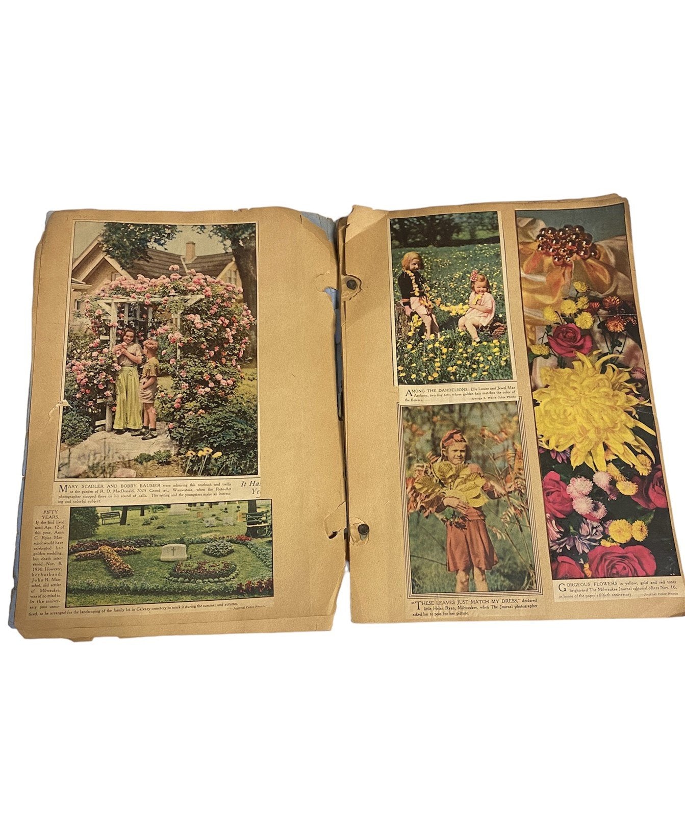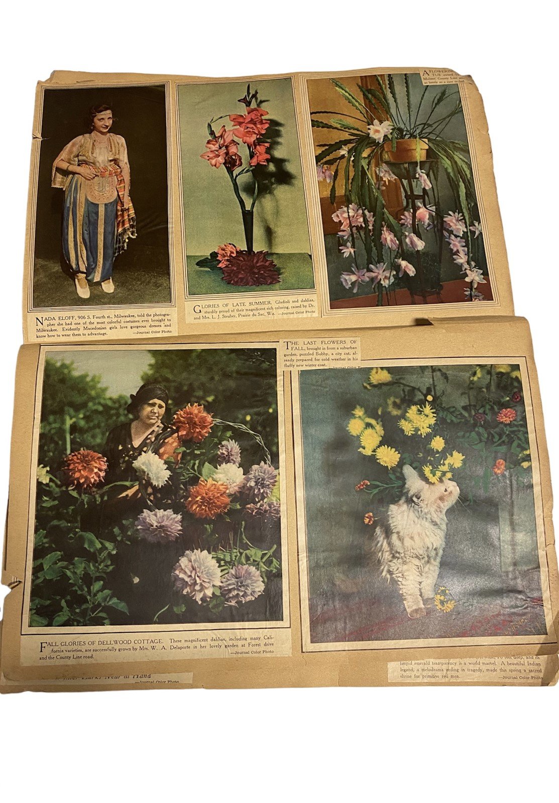 Antique Scrapbook c. 1930s, Color Newspaper Articles, Flowers, French Women