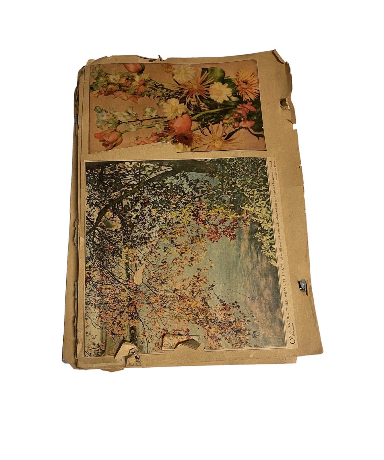 Beautiful Antique Scrapbook from the 1930s. This scrapbook features some of the most beautiful clips from newspaper articles from the early 19th century. I can imagine a classy lady spending her afternoon clipping images she thought were beautiful to make this unique item. The theme of this scrapbook is women, nature, flowers, birds, women in nature and anthropological events from that time. Item measures approx 15" x 10.50". Please note the books first 4 pages are not reinforced in anymore, item also has some tears along the edges, none that however interfere with the items function and beauty.Take a look at the pictures for the best description. A photo is as good as a thousand words and is the best description of cosmetic condition. Use your ZOOM TOOL to best see this item! Please look closely at the photos for condition answers.
