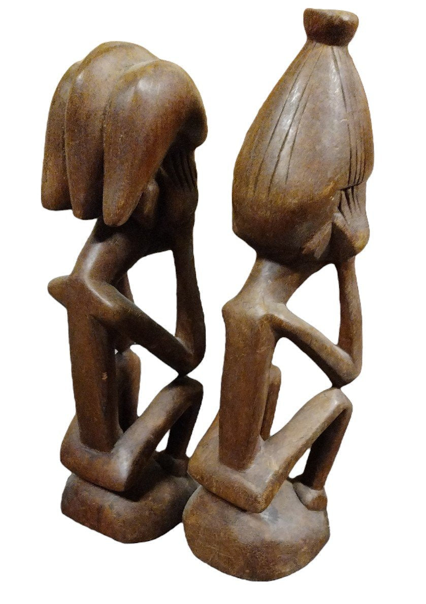 A pair of beautifully carved antique wooden African artisan "man and woman" statues. Gives a historical atmosphere to any home! Each status is 3.5" by 3.5" and 12" tall. Take a look at the pictures for the best description. A photo is as good as a thousand words and is the best description of cosmetic condition. Use your ZOOM TOOL to best see this item! Please look closely at the photos for condition answers. We describe items as best we can and as we see them. Some details may be missed but not intentionally. Condition of an item is our opinion. If you have any questions on the condition of these items let us know before you purchase! Thanks for looking!-
