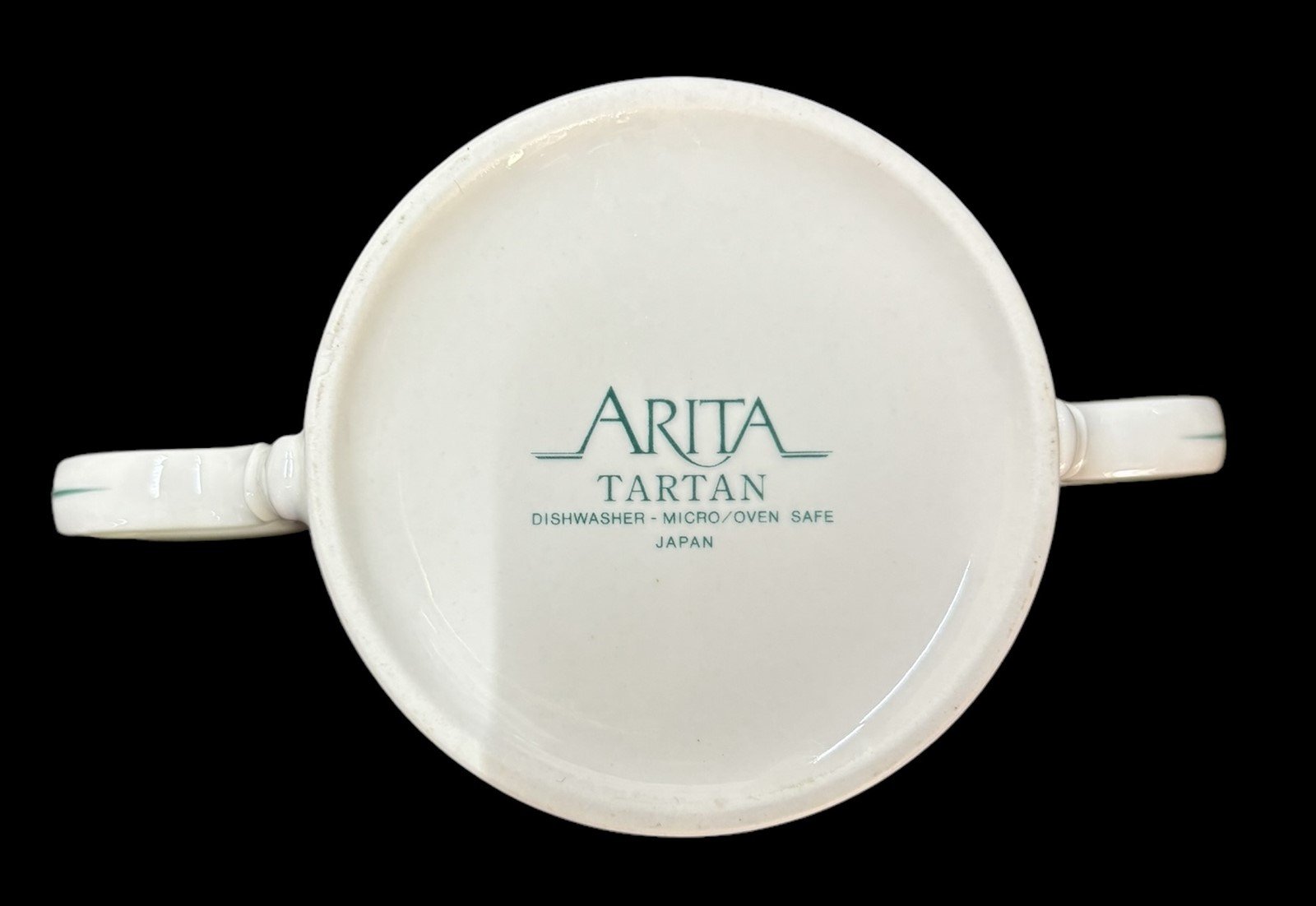 Set of 3 Arita Tartan Plaid Dishes. Includes a Mug, Bowl, and Plate. This set is so adorable and perfect for the holidays! The mug has two handles and features a ribbon plaid graphic along the sides and a jester Jack in the Box graphic on the inside. It measures 5.5 inches long with handles, 3 inches without, and 2.25 inches tall. The bowl features the plaid rim and a teddy bear graphic on the inside. It measures 7 inches in diameter and 2.25 inches tall. The plate measures 7.5 inches in diameter and features the plaid rim and an adorable rocking horse graphic in the middle. These are the cutest pieces and are all in amazing condition!Take a look at the pictures for the best description. A photo is as good as a thousand words and is the best description of cosmetic condition. Use your ZOOM TOOL to best see this item! Please look closely at the photos for condition answers.
