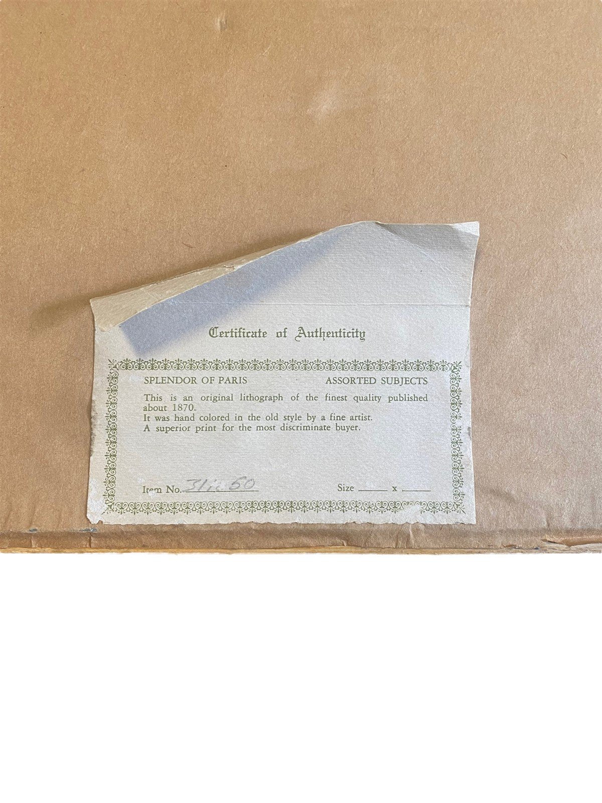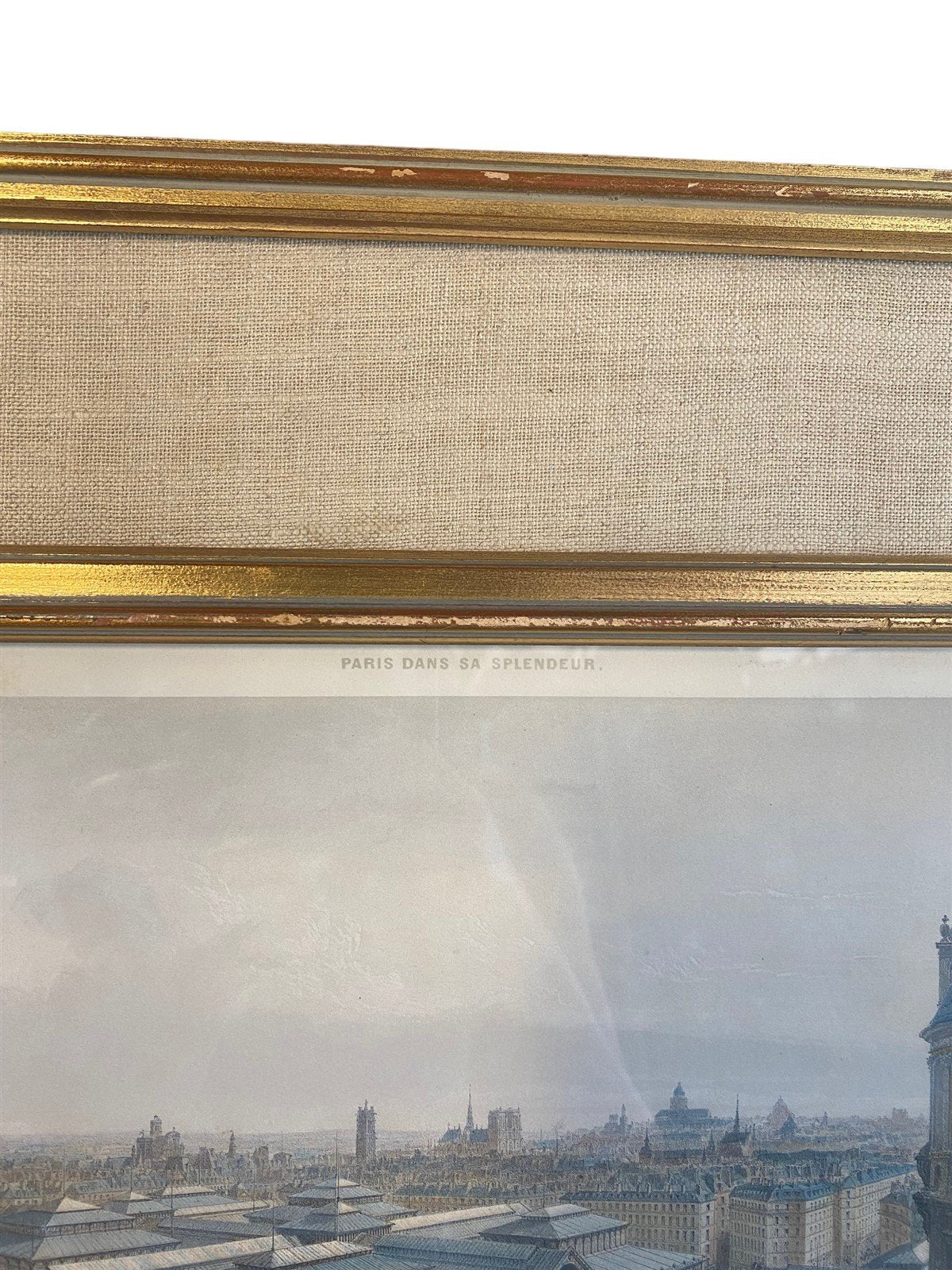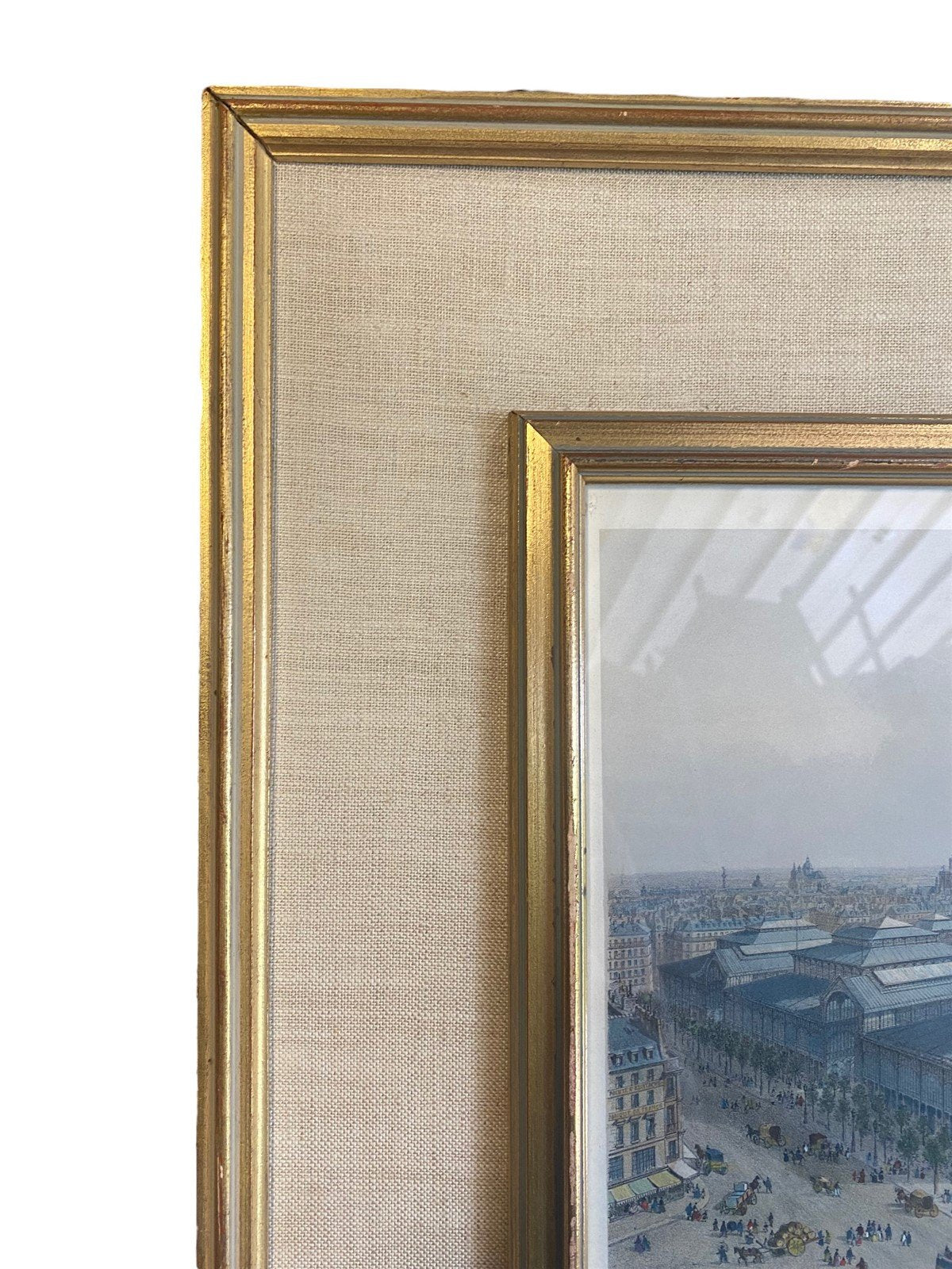 Authentic 1870 Lithograph Print of 'LES HALLES CENTRALES PARIS DANS SA SPLENDEUR'. This beautifully framed piece came from VICTORIUS Incorporated Charlottsville, Virginia. This is one piece directly from Paul Victorius' collection of fine art prints, antiquarian maps, books and manuscripts. Paul, born in New York in the early 1900s, left New York to study medicine in London in 1924. From there he started his collection of fine pieces, and is known to have an exquisite collection that has been sold to various buyers all around the world. His collection reputedly had become the largest and finest in the world, which included pieces owned by Charles Darwin himself. The city scape you see is of Les Halles De Paris, the central fresh food market and bustling street. The view is from the galleries of the church St. Eustache, 1861. The frame has some wears and flaws, however from one perception to another, the flaws could add to its beauty. The gold paint on the frame has some scratches that can be restored if you are not fond of them. The upper right corner has some minor tears on the fabric part of the frame. The back of this piece has some tears on the original paper back lining, all included in the photos to see for yourself. The piece is 24.25" long, 21.50" wide, and comes off the wall about 2". Overall, this piece is one of a kind and exceptionally beautiful. Item No. 311250.Take a look at the pictures for the best description. A photo is as good as a thousand words and is the best description of cosmetic condition. Use your ZOOM TOOL to best see this item! Please look closely at the photos for condition answers.