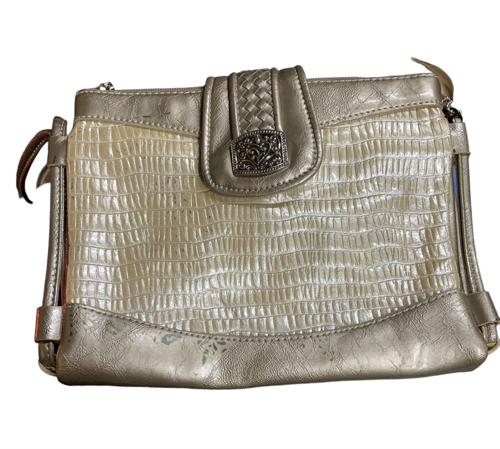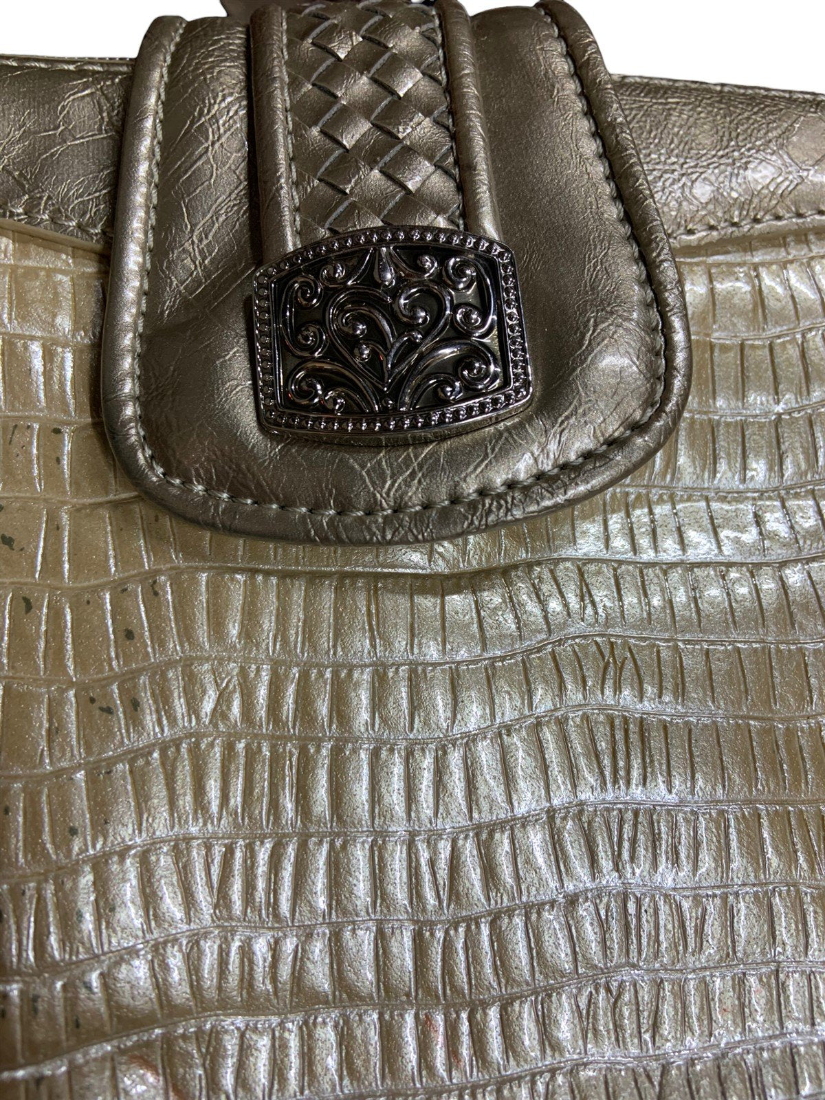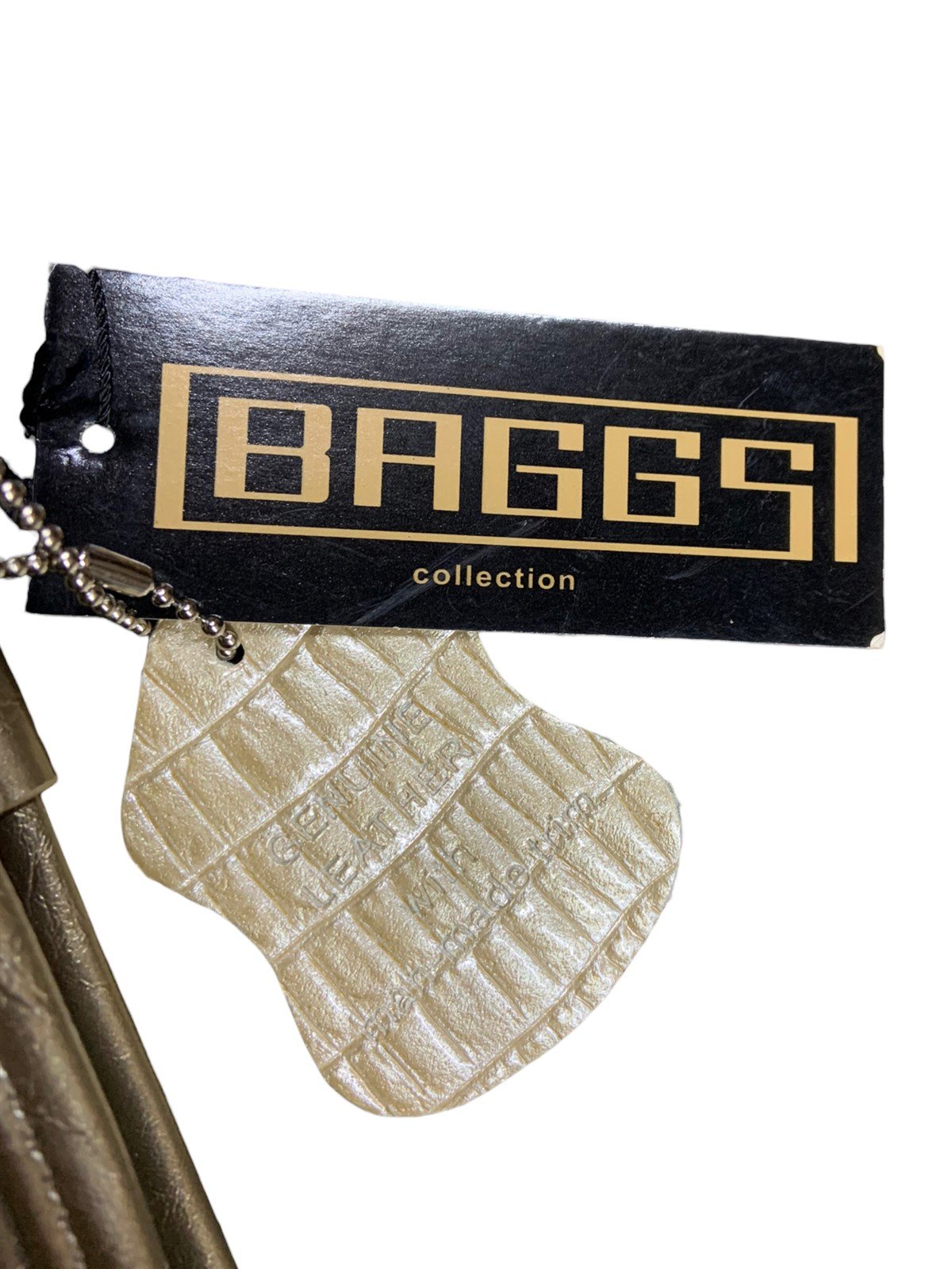 Gorgeous Purse from Baggs. This purse is so cute and very spacious! It has about 10 compartments, along with a few other tiny pockets. It has 3 zippered compartments, 1 on the back and 2 in the middle, and also a large compartment when the main latch is unclasped. The strap measures about 33 inches, measured from the loops, see last photo for clarity. The bag itself measures 10" x 8". It is tagged a genuine leather. The coloring is stunning, with a cream alligator print base and a pearlescent taupe border. The zippers are all perfect! The bag is in great condition! No rips or damage to the leather. There are a few small marks on the front, likely removeable and hardly noticeable. Such a great piece!Take a look at the pictures for the best description. A photo is as good as a thousand words and is the best description of cosmetic condition. Use your ZOOM TOOL to best see this item! Please look closely at the photos for condition answers.