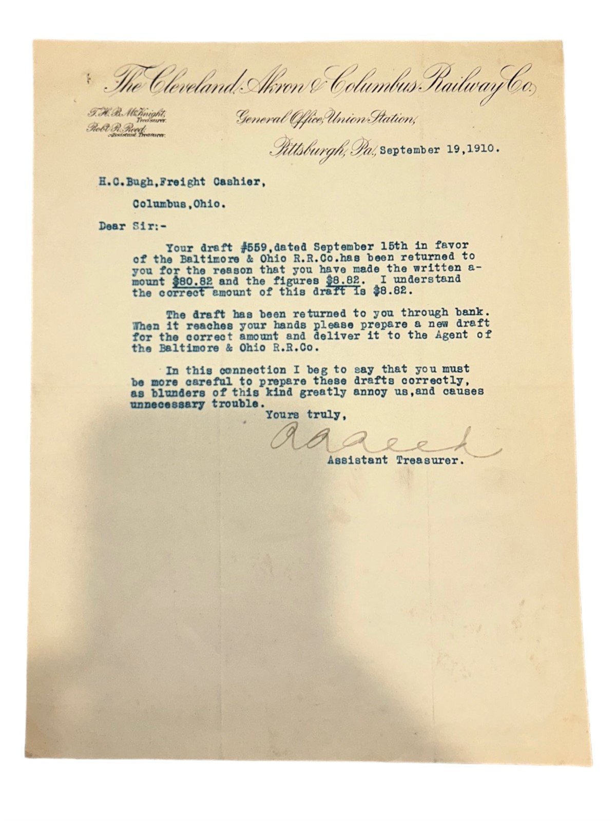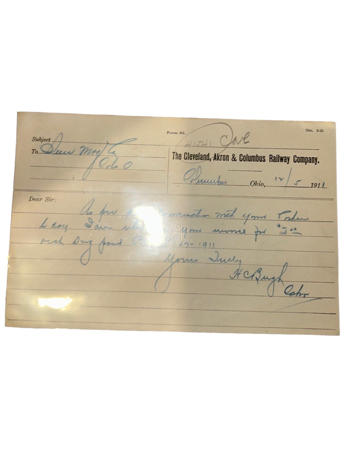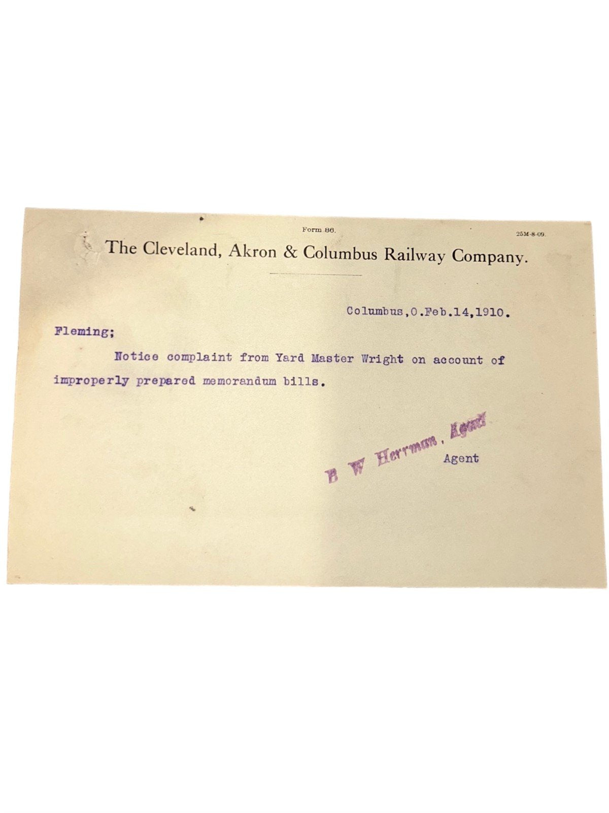 Here is a nice collection of 6 papers from the Cleveland, Akron and Columbus railway company from the early 1900’s. The collection includes a monthly report of freight waybills, a letter from the free cashier determining that they over, paid an invoice information on shipments and switches, and even had a complaint from yardmaster right about improperly prepared bills. Lastly, there’s also a hand written note this is a really nice collection mentioning Both New York, Central, Baltimore, and Ohio railroad, along with other neat information.Take a look at the pictures for the best description. A photo is as good as a thousand words and is the best description of cosmetic condition. Use your ZOOM TOOL to best see this item! Please look closely at the photos for condition answers.