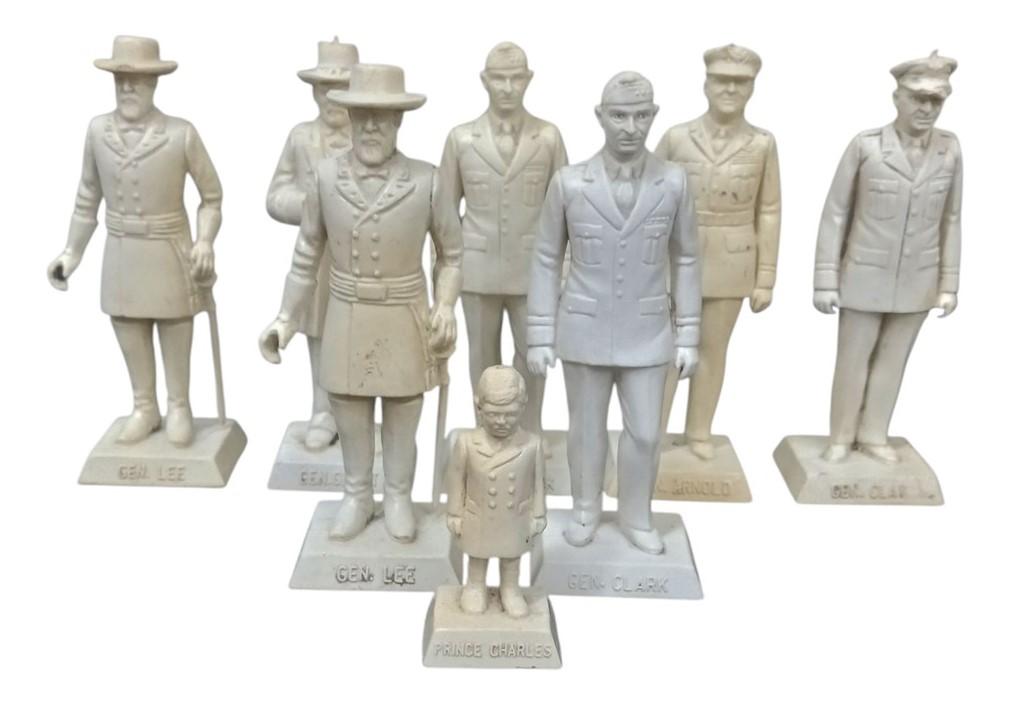 This is a set of vintage Marx figures likely made around the 1960s. Minor marks and scratches are visible. These are unpainted. This set is great for any aspiring collector and is perfect for filling out your toy collection! This set includes 2 General Clarks (about 1" by 3") 1 General Arnold (about 1" by 3") 1 General Clay (about 1" by 3") 2 General Lees (about 1" by 3") 1 General Grant (about 1" by 3") 1 Prince Charles (about 0.5" by 1")