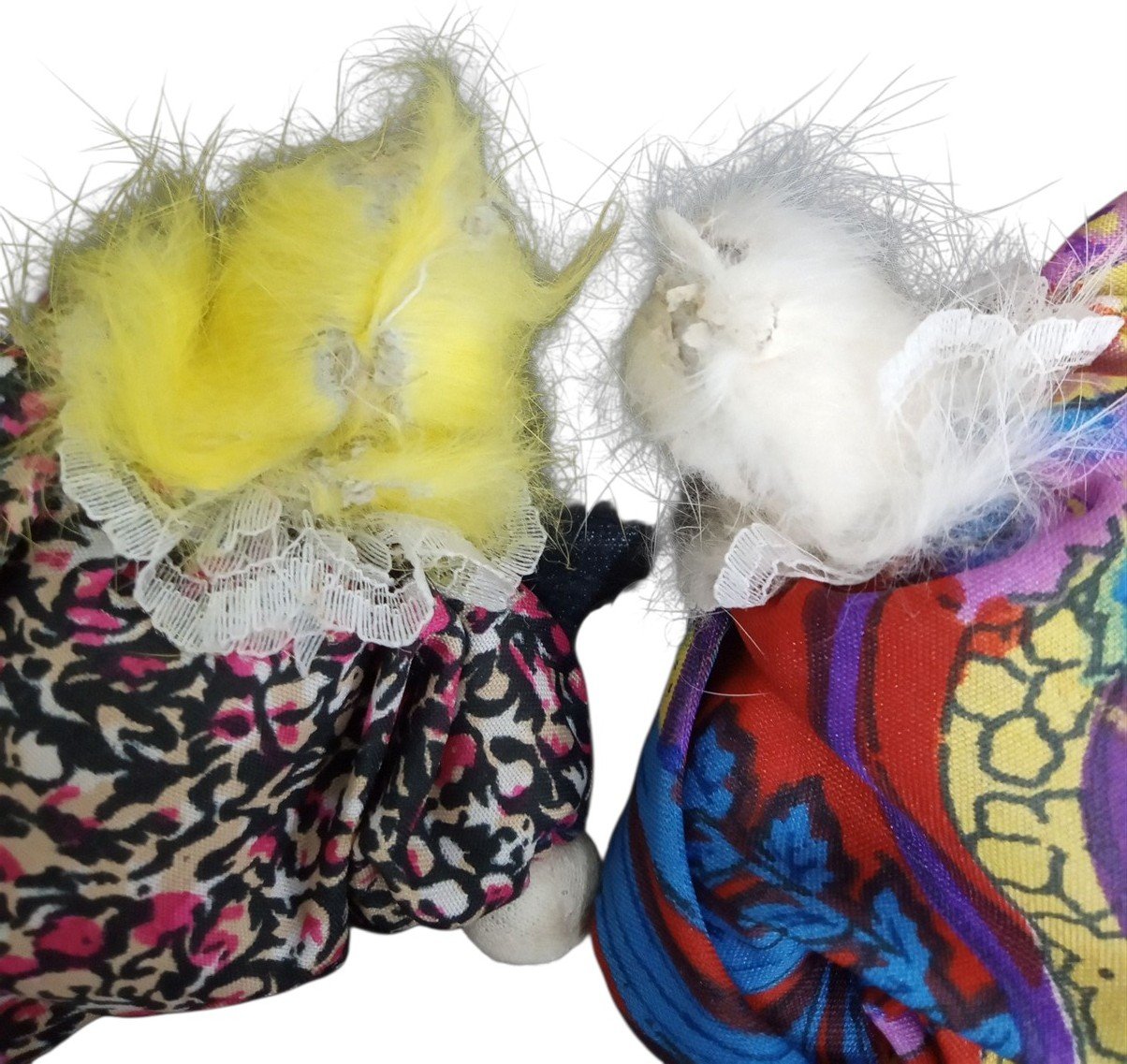 This is a pair of Q-Tee clown dolls likely made around the 1980s. Some marks and stains are visible. The heads of each doll has visible tears. This set is great for any aspiring collector and would make a lovely Christmas gift! Each clown measures about 4.5" by 4" by 1.5".