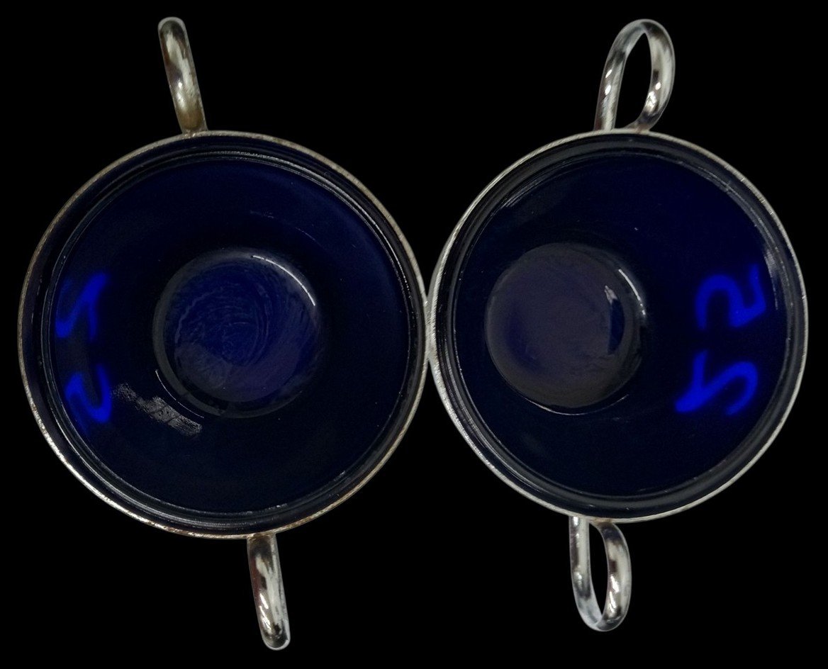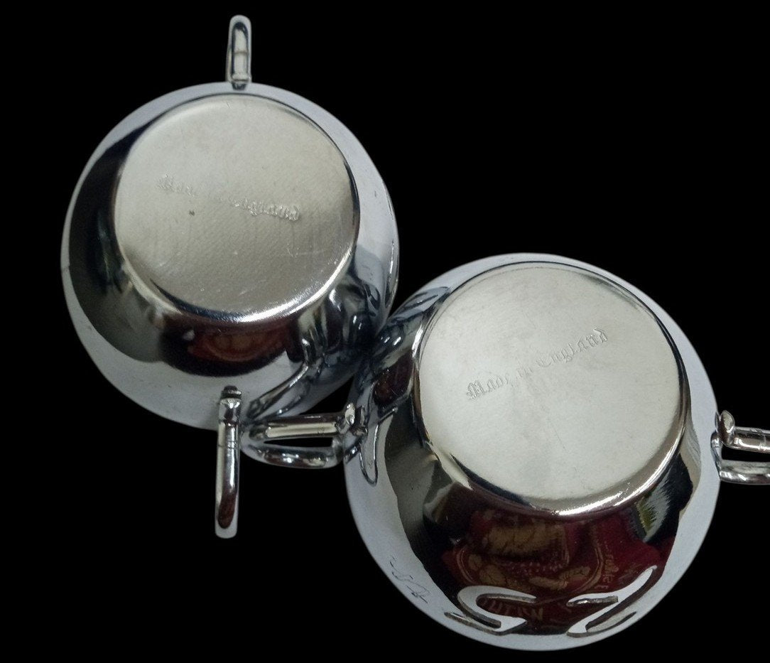 This is a pair of silverplate sugar bowls made in England likely around the 1980s. Marks and scratches are visible as well as spots of rust. This set is great for any aspiring collector and would make a lovely gift! Each bowl measures about 4.5" by 3" by 2",