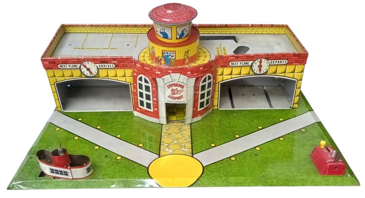 This is a Superior tin airport playset manufactured by T.Cohn likely around the 1960s. Marks and scratches are visible. Various pieces are missing. The entrance arch is loose. The mechanisms are untested. Some warping is visible. This is a great item for any aspiring toy collector and would make an awesome vintage display piece! This measures about 24" by 19" by 9".