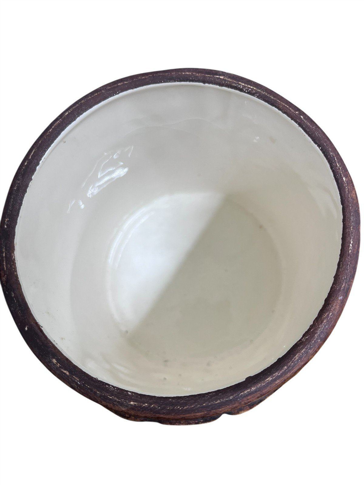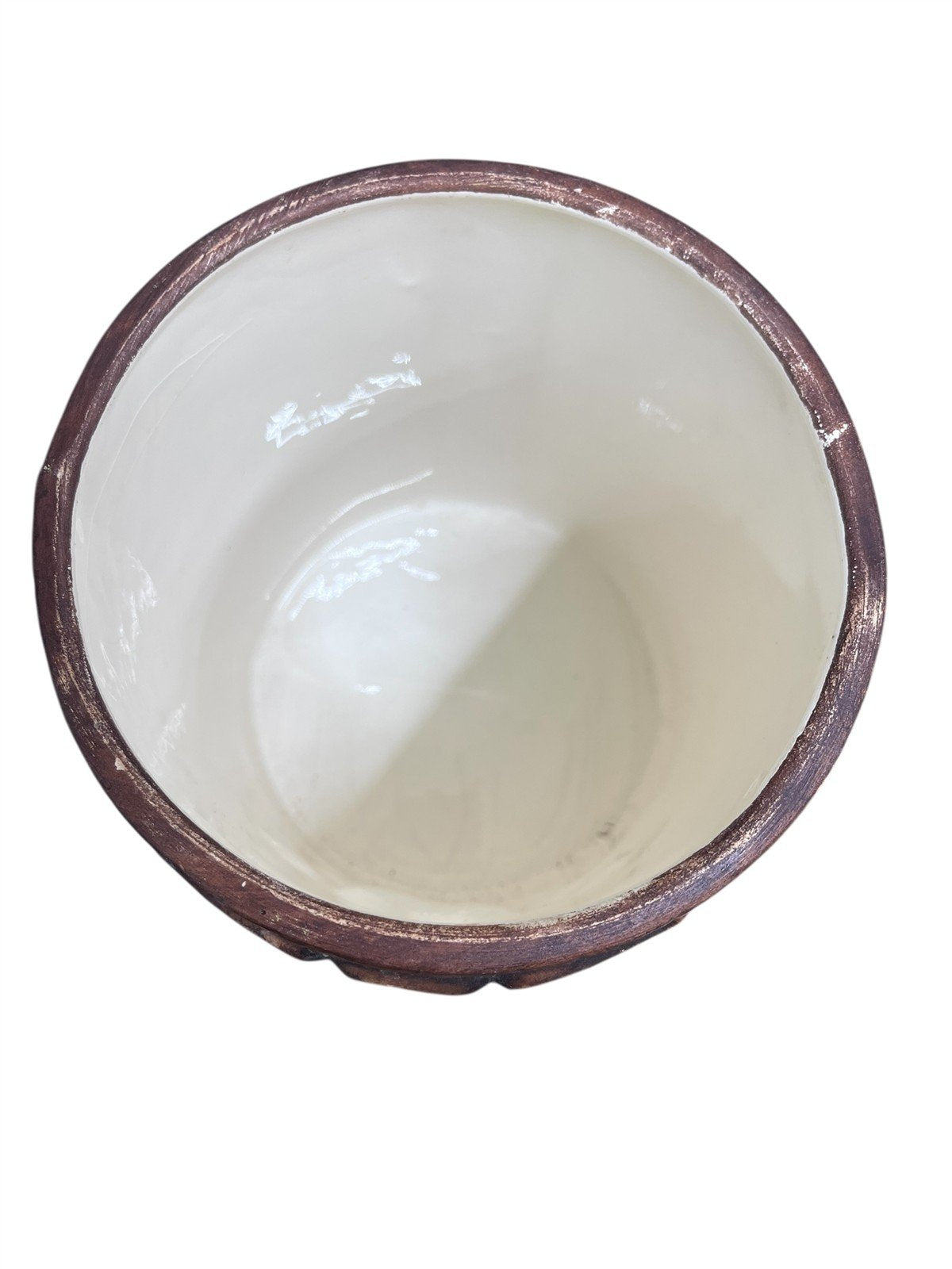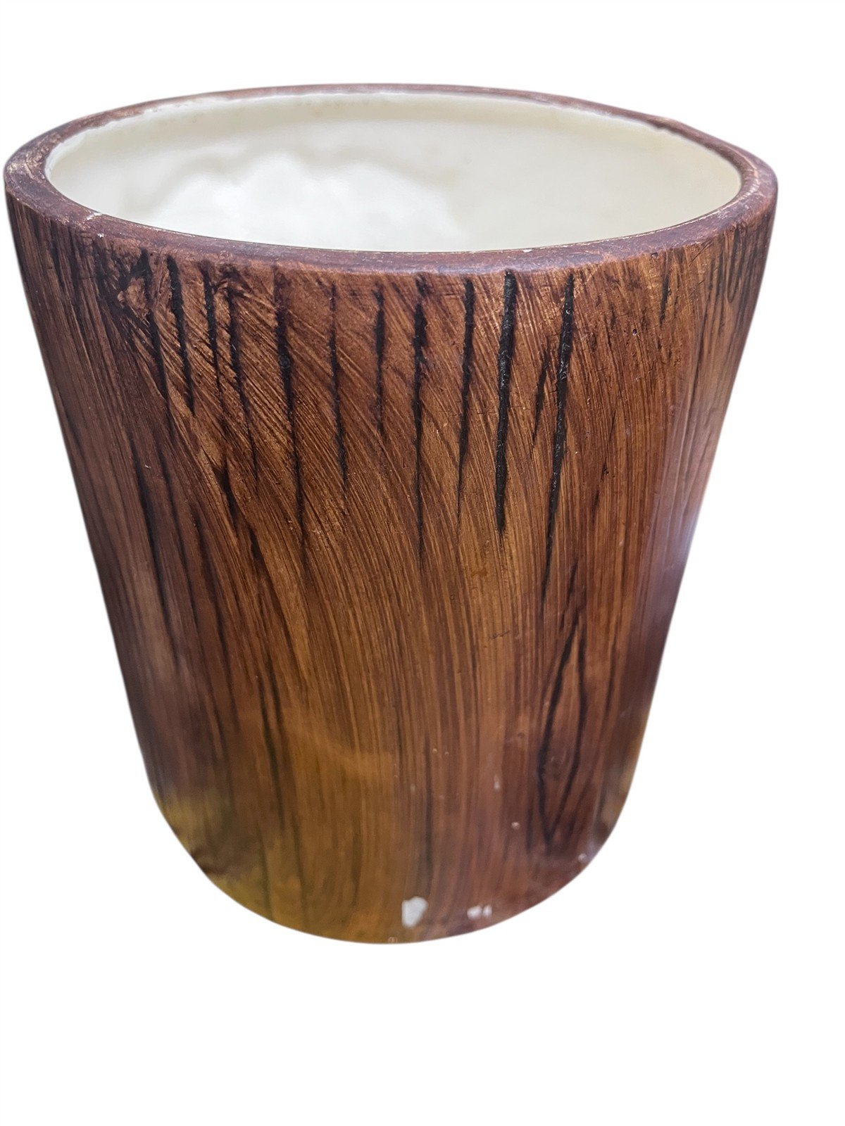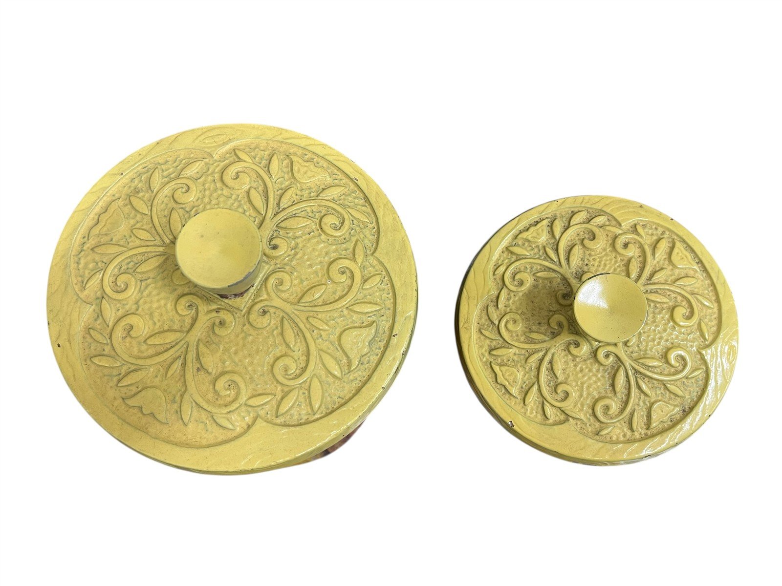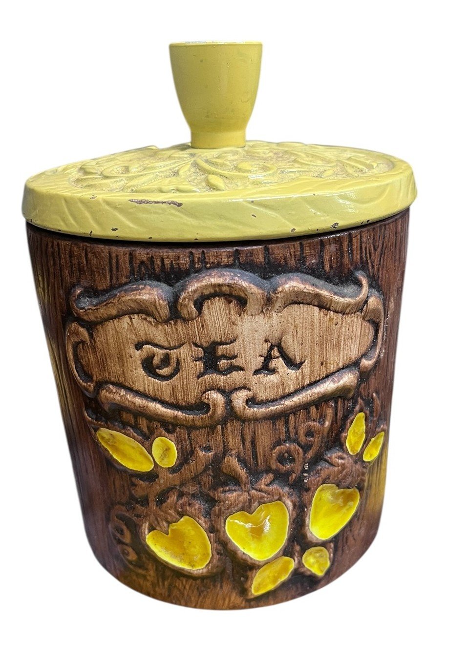 These are two beautiful woodgrain canisters with yellow ornate lids. The larger one reads "Sugar", while the smaller one reads "Tea". There is a small chip on the back of the larger canister (see pic), but they are otherwise in great condition! The larger one measure 8" tall and 7" wide. The smaller one measures 6" tall and 6" wide.Take a look at the pictures for the best description. A photo is as good as a thousand words and is the best description of cosmetic condition. Use your ZOOM TOOL to best see this item! Please look closely at the photos for condition answers.