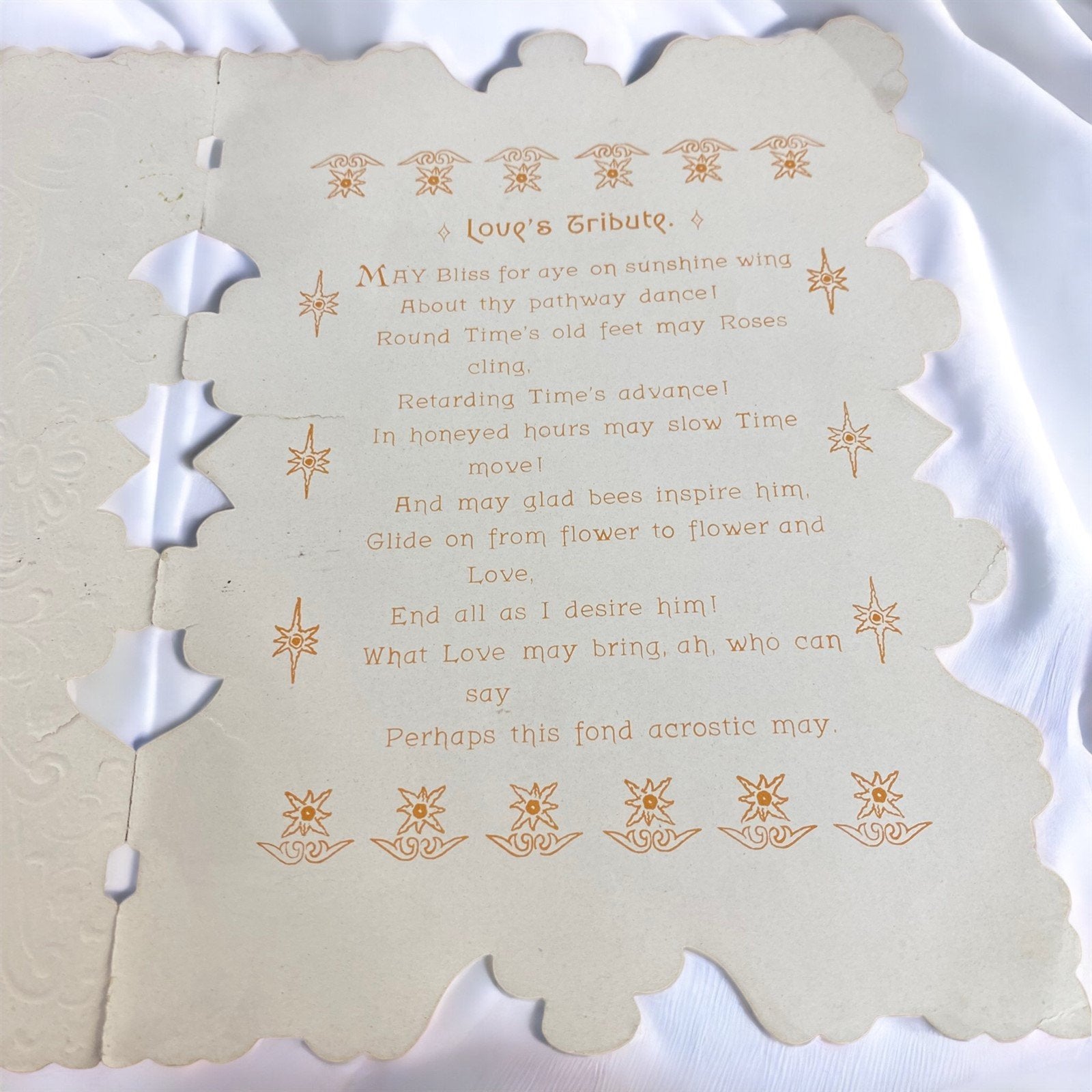 The most adorable handmade vintage valentines day card. The front of the card has a intricate, yet delicate floral pattern, with various flowers and a cream color, die cut, lace paper overlay. Lots of baby blue and gold swirls. In the middle is a cut out of a cute little girl holding flowers in her apron. Above her is another cut out of a woman with blonde hair and gorgeous facial features. The inside of the card has a poem titled "Loves Tribute" and it says " May bliss for aye on sunshine wing About thy pathway dance! Round time's old feet may roses cling, Retarding time's advance! In honeyed hours may slow time move! And may glad bees inspire him, Glide on from flower to flower and love, End all as I desire him! What love may bring, ah, who can say. Perhaps this fond acrostic may." 6" x 5"Take a look at the pictures for the best description. A photo is as good as a thousand words and is the best description of cosmetic condition. Use your ZOOM TOOL to best see this item! Please look closely at the photos for condition answers.