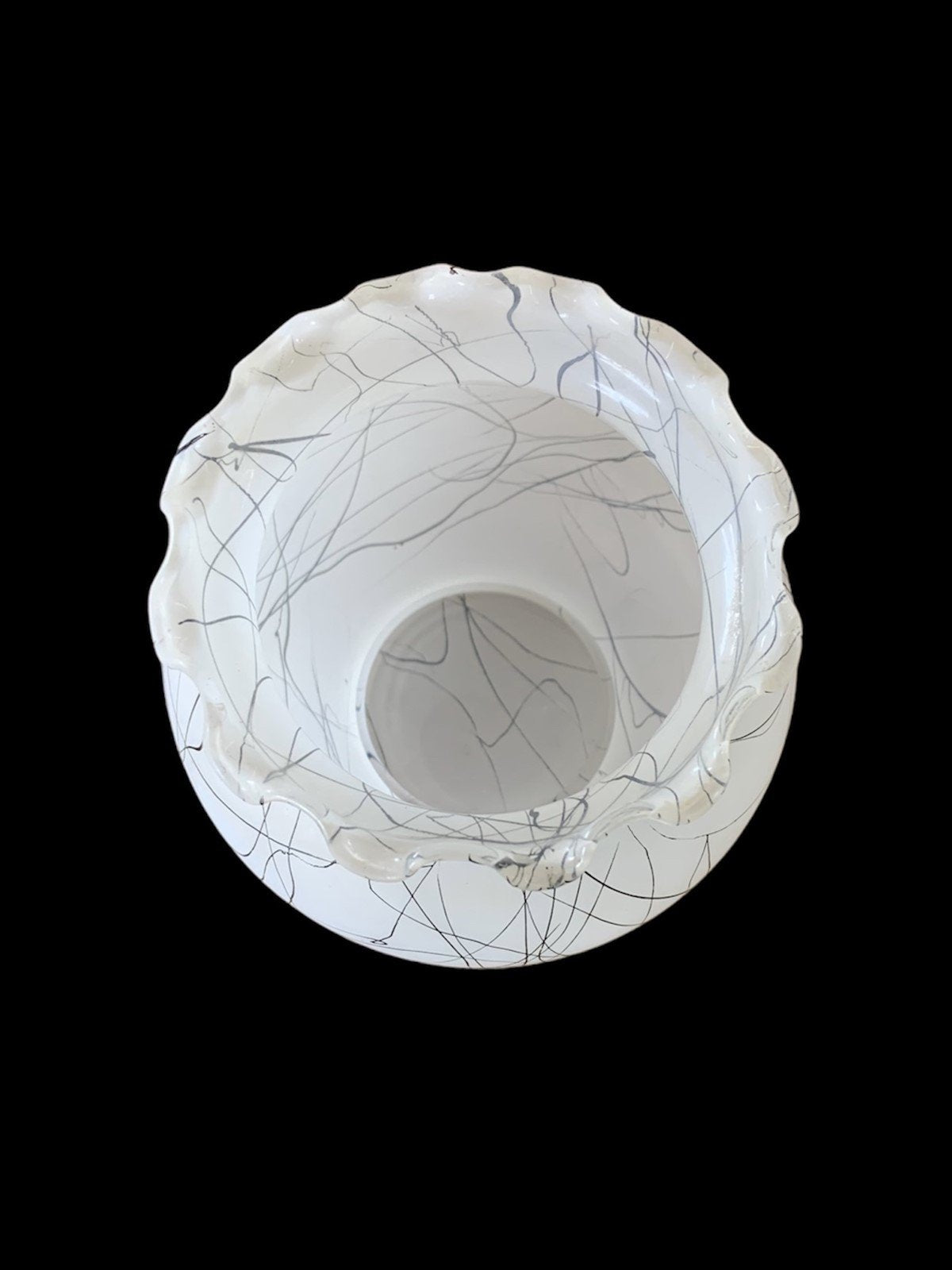 Vintage 1970's Frosted White Black String Glass Vase Spaghetti Drizzle Scalloped