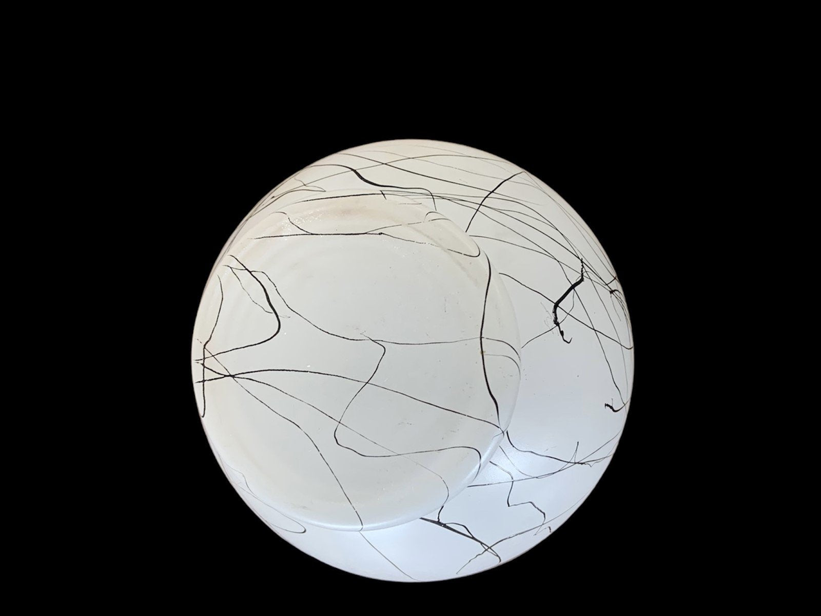 Gorgeous vintage vase from the 1970s. This piece is so cool and unique! It features black string art over white frosted glass, with a scalloped edge. This vase would fit so many decor themes and would be perfect for any home! item is 6 inches tall and 5 inches across.Take a look at the pictures for the best description. A photo is as good as a thousand words and is the best description of cosmetic condition. Use your ZOOM TOOL to best see this item! Please look closely at the photos for condition answers.