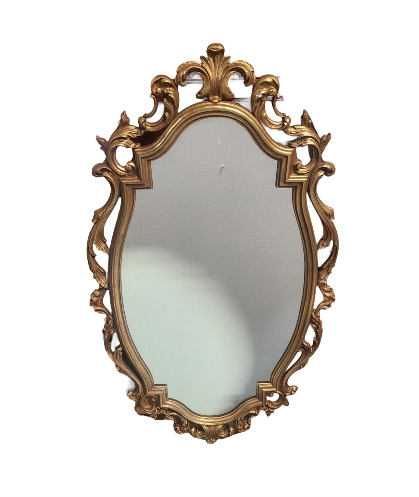 Check out this gorgeous, gold MCM mirror by Syroco! This large, oval shaped mirror would match nearly any modern or vintage decor, with the gold color and ornate frame design. This has hooks to hang it vertically or horizontally. Measures approx. 42" x 23". Origin date est. 1960s. Take a look at the pictures for the best description. A photo is as good as a thousand words and is the best description of cosmetic condition. Use your ZOOM TOOL to best see this item! Please look closely at the photos for condition answers. We describe items as best we can and as we see them. Some details may be missed but not intentionally. Condition of an item is our opinion. If you have any questions on the condition of these items let us know before you purchase! Thanks for looking!-