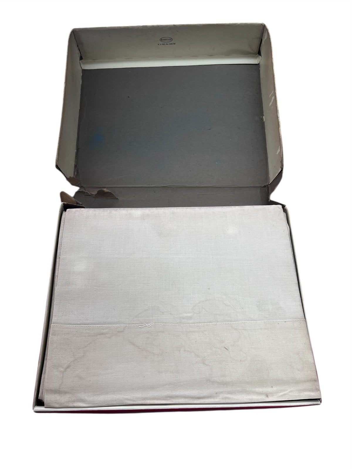 These are two boxes of vintage Pepperell brand red label pre-laundered bed sheets. Each box contains two sheets, each 81" x 99". The box measures 11" x 9" x 2.5". The boxes have some sun damage but are otherwise in good condition. The sheets have not been removed but have some staining (see pictures).Take a look at the pictures for the best description. A photo is as good as a thousand words and is the best description of cosmetic condition. Use your ZOOM TOOL to best see this item! Please look closely at the photos for condition answers.
